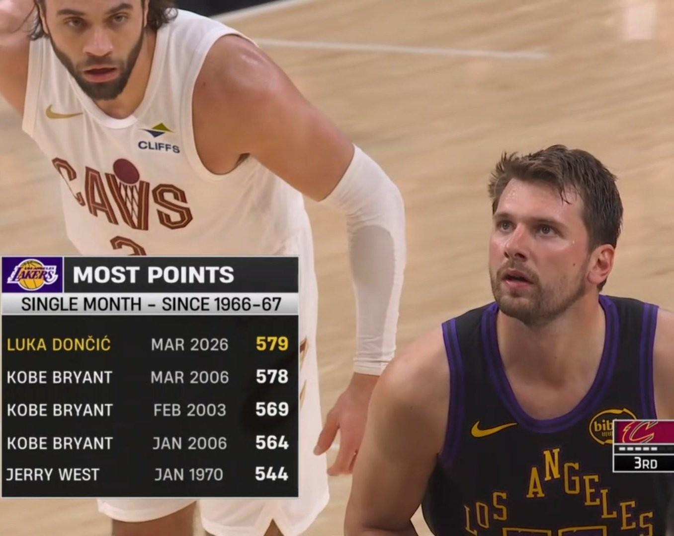 北京时间4月1日,NBA常规赛迎来一场备受瞩目的对决,洛杉矶湖人队坐镇主场,迎接克利夫兰骑士队的挑战。 比赛进行到第三节,东契奇展现出了他的得分能力,成功制造犯规并两罚全中。至此,他本场比赛的个人得分已经累积到22分,而他在三月份的总得分也攀升至580分,成功打破了科比此前保持的578分的湖人队史单月总得分纪录,书写了属于自己的新篇章。