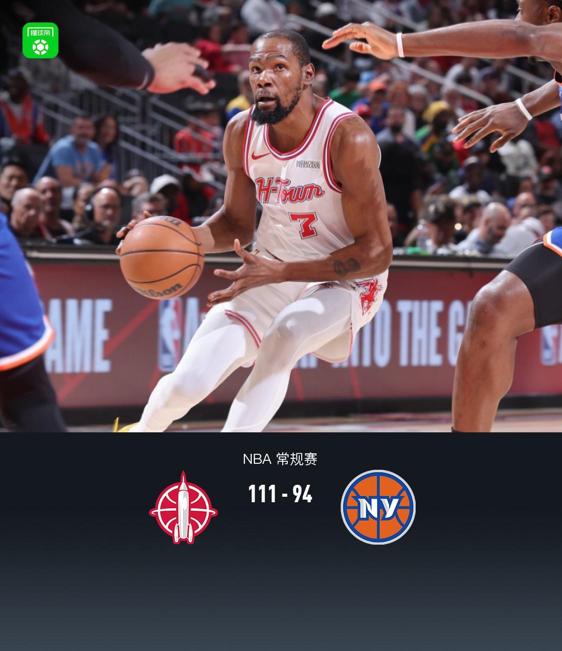 北京时间4月1日,NBA常规赛迎来一场焦点对决,休斯顿火箭坐镇主场迎战纽约尼克斯。经过四节激战,火箭以111-94的比分力克尼克斯,收获一场宝贵的胜利。 本场比赛,火箭队核心杜兰特发挥出色,全场砍下27分,并贡献6个篮板和8次助攻,成为球队获胜的最大功臣。而里德-谢泼德同样表现出色,他得到20分,并抢下5个篮板,送出2次助攻,为球队的胜利立下汗马功劳。尼克斯方面,唐斯得到22分,并抢下8个篮板,送出3次助攻,但无奈球队整体表现不佳,最终遗憾落败。约什-哈特也有13分入账,但同样未能帮助球队扭转局势。