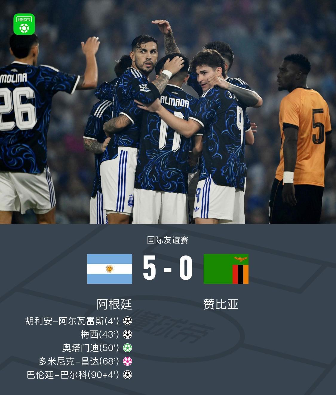 北京时间4月1日晚间,在一场备受瞩目的国际友谊赛中,阿根廷队与赞比亚队展开激烈较量。此役,阿根廷队火力全开,胡利安 - 阿尔瓦雷斯、梅西、奥塔门迪纷纷建功,赞比亚队的多米尼克 - 昌达还自摆乌龙,最终阿根廷以5-0的悬殊比分大胜赞比亚。 关键赛事节点回顾 比赛进行到第4分钟,梅西在场上展现出超强的传球视野,他精准横传,阿尔瓦雷斯接球后冷静低射,皮球应声入网,阿根廷1 - 0率先打破僵局,取得梦幻开局。 第44分钟,麦卡利斯特送出巧妙助攻,梅西抓住机会,小角度劲射,皮球如炮弹般直入网窝,比分扩大为2 - 0,阿根廷带着领先优势进入中场休息。 下半场第50分钟,场上出现感人一幕,梅西展现出了高风亮节,主动让点,奥塔门迪主罚命中,完成了他在这片主场上的告别战进球,阿根廷3 - 0继续扩大优势。 第68分钟,阿尔马达在边路送出横传,多米尼克 - 昌达忙中出错,不慎将球碰入自家球门,阿根廷4 - 0领先,胜利的天平已经完全倒向阿根廷。 比赛进入伤停补时第90 + 4分钟,冈萨雷斯脚后跟妙传,巴尔科心领神会,推射破门,阿根廷5 - 0锁定胜局,以一场酣畅淋漓的大胜结束了这场友谊赛。