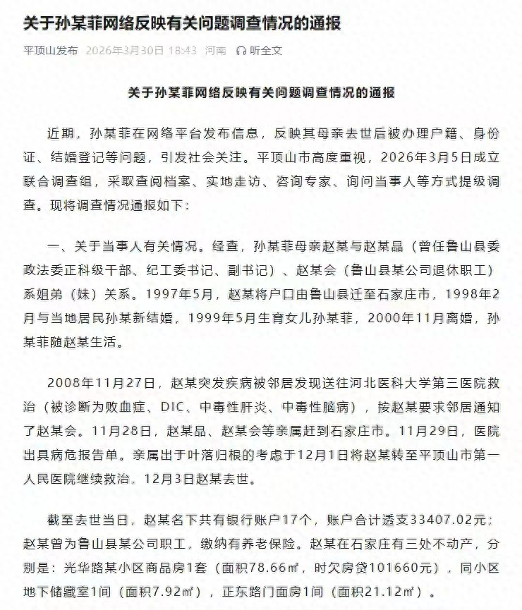 3月30日,平顶山官方调查组对外公布了“鲁山亡母被登记结婚事件”的调查处理结果。 尽管通报内容篇幅较长,但核心要点可概括为以下几点: 调查未发现孙某菲的舅舅赵某品及其小姨赵某会存在侵占孙某菲母亲赵某遗产的行为。 赵某名下的房产、门面租金以及玉器等资产,均用于偿还赵某生前的房贷、银行卡透支、住院治疗费用及丧葬开支,剩余资金则全部用于孙某菲的抚养。 经查,马某(孙某菲舅妈)冒用赵某身份,主要是为了非法领取赵某的养老金。 目前,赵某品已被撤职并开除党籍,接受相应纪律处分。 事件回顾 从去年12月底至今年2月,孙某菲持续在网络平台上举报其舅舅赵某品和小姨赵某会侵占其母亲遗产。 孙某菲表示,母亲生前曾将多套房产、铺面及大量玉器珠宝交由小姨赵某会代管,并承诺待自己成年后过户至其名下。 然而,在办理继承手续时,孙某菲发现仅剩下一间铺面,且无法办理继承,原因是母亲已再婚并育有其他子女。 随后,鲁山官方成立调查组,后由平顶山调查组接手并深入调查。 按理说,这份调查结果应具有高度的严谨性和权威性,但孙某菲仍对部分结论表示质疑。 孙某菲最新表态 通报发布后不久,徽声在线记者在当晚对孙某菲进行了采访。 孙某菲坦言,看到调查结果后心情沉重,尤其是对舅舅赵某品的处理决定感到不满,认为撤职对其影响不大,因为他即将在10月退休,但她仍表示尊重调查组的决定。 此外,孙某菲还透露,母亲并非在医院去世,且自己未能见到母亲最后一面,因此对母亲死因存疑。关于抚养权和财产代管权的问题,她本想通过法律途径解决,但未能找到愿意代理的律师。 徽声在线记者还就放弃抚养权一事采访了孙某菲的父亲。 孙父表示,当年他去鲁山接孩子时,虽怀疑抚养协议可能是伪造的,但因对方在鲁山势力庞大,且现场聚集了众多人员,他无奈选择放弃,这一决定让他错失了孩子成长的关键时期,至今仍深感懊悔。 对于这份调查通报,多数网友认为内容详实、有理有据。 然而,对于赵某品等人的处理决定,网友们看法不一。 有网友认为,对赵某品仅撤职而未开除公职,退休后仍可领取工资,处理力度不够。 另外,针对马某冒领养老金一事,有网友表示难以理解,认为用死人的身份冒领养老金,实在令人难以接受。 归根结底,这起事件还是暴露了赵某品手中权力的滥用问题。许多看似不可思议、荒唐至极的事情,在他一句话下就能轻易办成。那么,我们不禁要问,他是否还存在其他方面的违规违纪行为呢? |