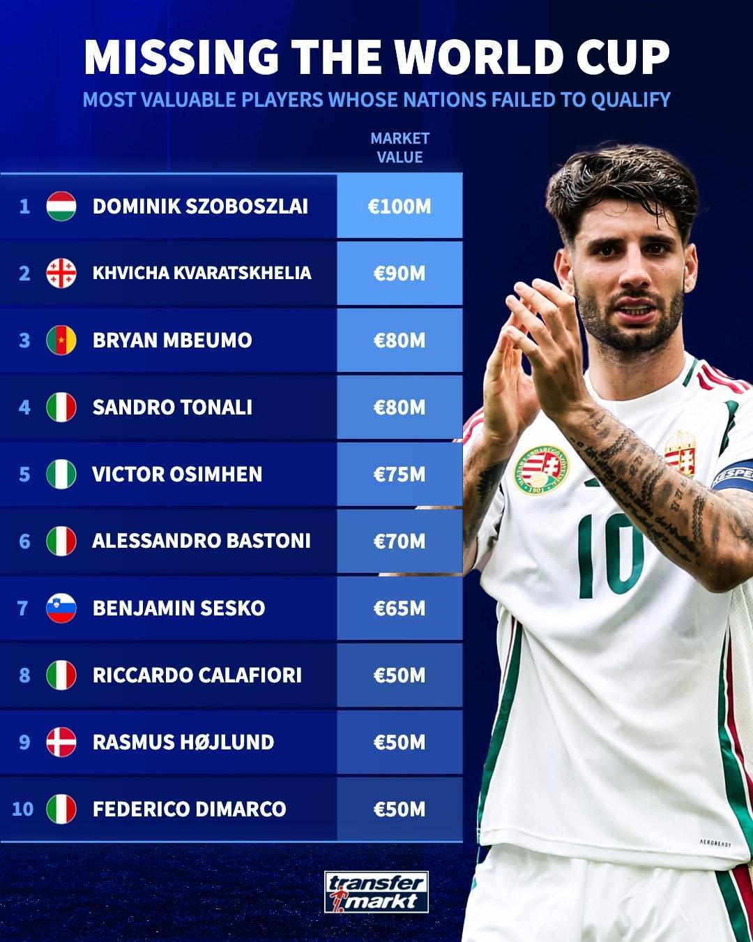 根据权威转会数据机构德国转会市场网的最新统计,我们得以一窥那些无缘2026年美加墨世界杯的球星身价排行榜。在这份榜单中,利物浦中场索博斯洛伊以高达1亿欧元的身价傲视群雄,而意大利国家队则成为了“失意者联盟”中的最大代表,共有4名球员跻身前十。 无缘2026年美加墨世界杯球员身价TOP10详解: 榜首之位:匈牙利中场索博斯洛伊(利物浦)以1亿欧元的身价领跑榜单,这位年轻才俊的缺席无疑让匈牙利队的中场实力大打折扣。 紧随其后:格鲁吉亚前锋克瓦拉茨赫利亚(巴黎圣日耳曼)以9000万欧元的身价位列第二,他的速度和射门能力让无数对手闻风丧胆。 并列第三:喀麦隆前锋姆伯莫(曼联)和意大利中场托纳利(纽卡斯尔联)均以8000万欧元的身价并列第三,姆伯莫的突破能力出众,而托纳利则是意大利中场的新星。 第五名:尼日利亚前锋奥斯梅恩(加拉塔萨雷)以7500万欧元的身价排名第五,他的进球效率一直备受瞩目。 第六名:意大利后卫巴斯托尼(国际米兰)以7000万欧元的身价位列第六,他的防守稳健,是意大利后防线上的重要一环。 第七名:斯洛文尼亚前锋谢什科(曼联)以6500万欧元的身价排名第七,这位年轻前锋的潜力巨大,未来可期。 并列第八:意大利后卫卡拉菲奥里(阿森纳)、丹麦前锋霍伊伦(那不勒斯)以及意大利后卫迪马尔科(国际米兰)均以5000万欧元的身价并列第八,他们的缺席也让各自的国家队实力受到了一定影响。 |