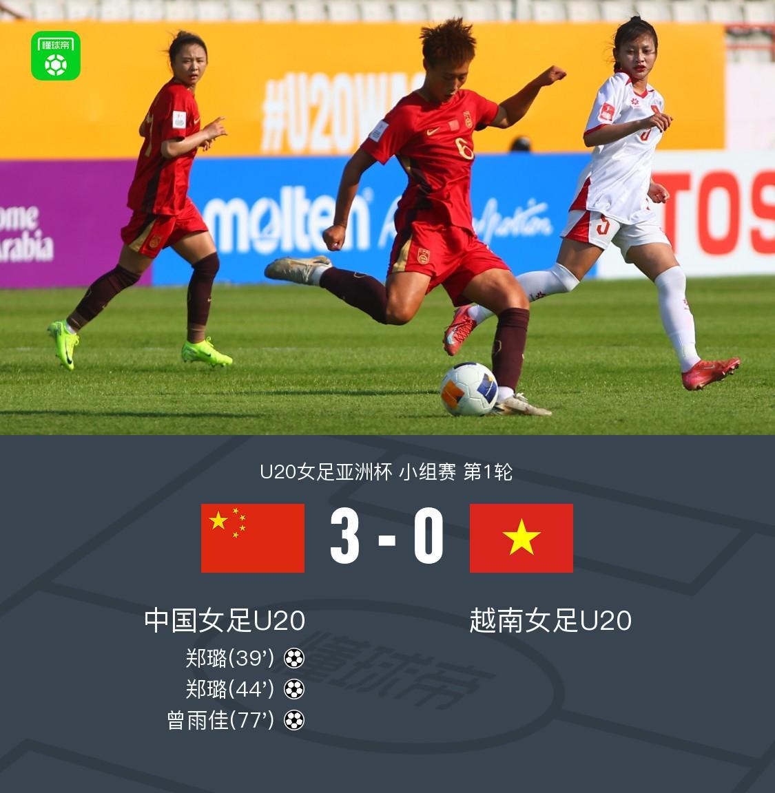 在4月1日进行的U20女足亚洲杯小组赛首轮较量中,中国U20女足与越南U20女足展开了一场精彩对决。最终,凭借郑璐的出色发挥以及曾雨佳的关键进球,中国队以3 - 0的比分轻松战胜对手,成功迎来开门红。 比赛中的关键事件回顾 第39分钟,比赛局势迎来转折。越南队在防守时出现解围失误,中国队球员郑璐敏锐捕捉到这一机会,果断推射,皮球应声入网,中国U20女足1 - 0领先,打破了场上的僵局。 仅仅过了5分钟,也就是第44分钟,郑璐再次展现强大实力。她凭借出色的跑位抢点成功,再次攻破对方球门,完成梅开二度,中国U20女足将比分扩大至2 - 0。 第77分钟,比赛悬念基本终结。中国队获得绝佳机会,曾雨佳轻松补射得分,中国U20女足3 - 0锁定胜局。