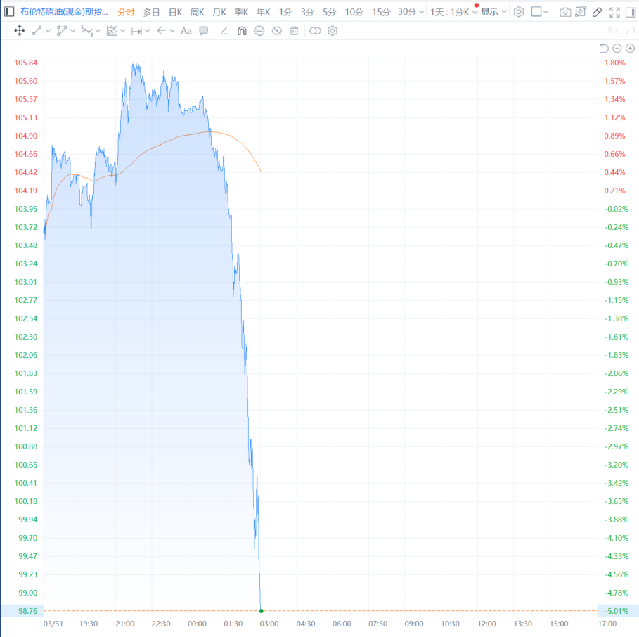 据徽声在线4月1日消息,近期市场上流传着一种乐观的预期,即伊朗地区的冲突局势有望迎来和平的曙光,可能即将画上句号。受此消息影响,国际原油市场出现显著波动,其中布伦特原油期货价格跌幅进一步扩大,目前已经达到5%,当前报价为每桶98.76美元。 |