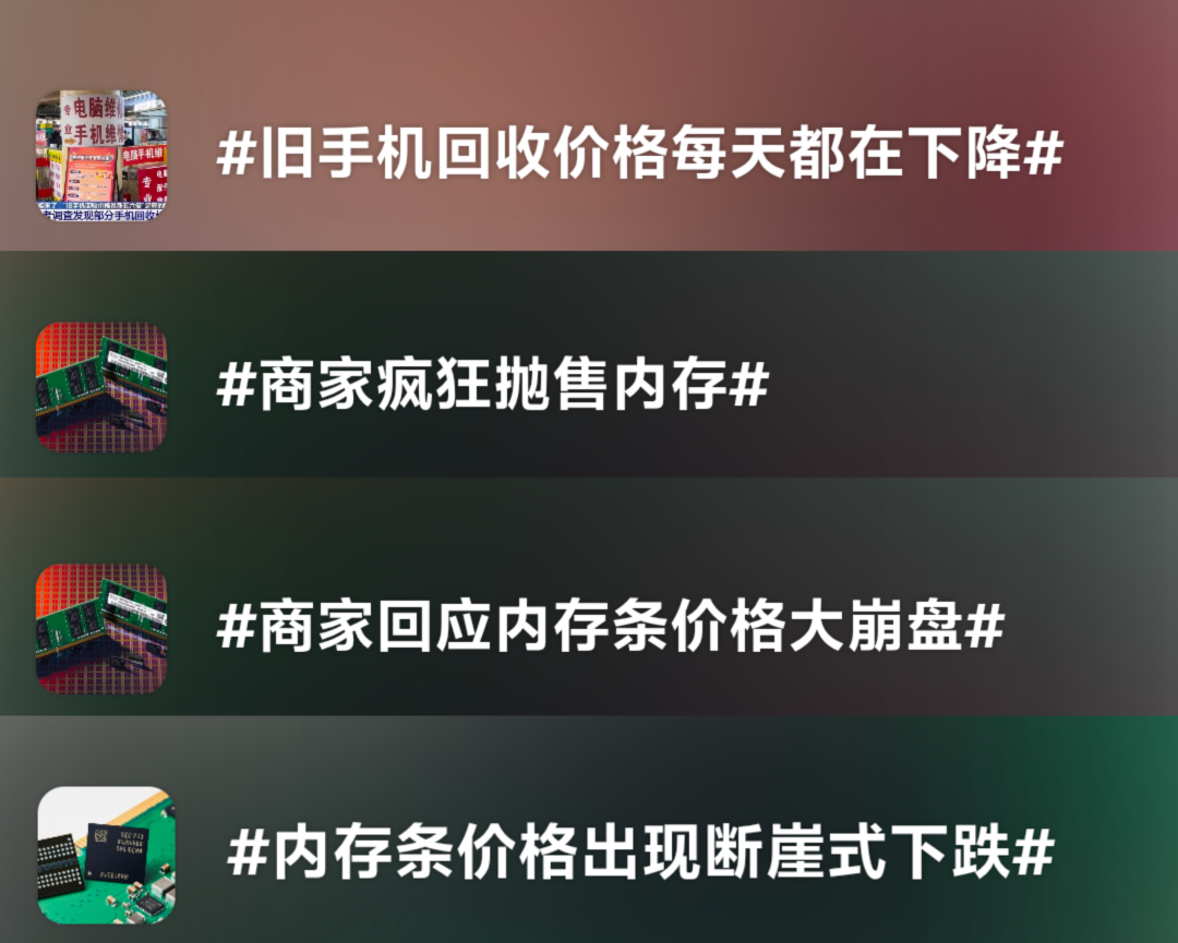 在人工智能算力需求迅猛增长的背景下 全球内存生产能力难以满足市场需求 内存相关产品价格持续攀升 然而,就在市场热情高涨之时,近日 “内存条价格骤然暴跌”的讨论 迅速登上热搜榜首 此前相关报道: 网友们纷纷热议 “内存条价格彻底崩盘 等待派大获全胜 这波跌幅简直像悬崖一样...” “内存价格大幅跳水 DDR5跌破3000元大关” 据徽声在线报道,3月30日,记者在某二手交易平台查询发现,内存条近7日成交均价较前一周下滑50元,降至350元;DDR5成交均价较前一周下跌20元,降至1090元。 深圳华强北出现内存条抛售热潮 据财联社消息,记者30日实地探访深圳华强北电子市场了解到,自上周以来,DDR5内存条现货价格显著下降。 其中,上周每条售价约3000元的32G DDR5内存条,本周报价每条降幅在500至1050元之间。“刚刚以2500元/条的价格处理了一批货。”有商户表示,目前部分DDR5产品正处于抛售阶段,甚至有商户给出了1950元/条的抛售价。 3月30日,第一现场记者深入深圳华强北,实地了解内存条市场现状。有商家表示,价格不会一天跌几百元,没那么夸张。但目前确实亏损严重,估计亏损几十万元起步。 对于未来市场走势,受访商家意见不一:有商家认为价格可能继续下滑,但也有商家认为,由于上游价格支撑,此轮降价行情可能难以持续。 一位涉及内存条业务的上市公司人士表示,此轮抛售可能与短期装机等市场需求不振、下游商家希望快速回笼资金有关,但价格回调不会改变包括内存条在内的整个存储行业的上行趋势。 价格下降背后的原因 自去年四季度内存涨价潮启动以来,许多个人消费者的购买需求受到抑制,他们选择购买容量更小的内存或转向二手市场,这在一定程度上抑制了内存产品的出货量。不少华强北商户表示,去年的涨价潮对生意影响较大,成交量普遍下滑,这也是近期内存价格开始下降的主要原因。 融通基金管理有限公司权益研究部副总经理刘安坤分析称:主要是部分代理商和囤货的投机商,看到现货价格不再上涨后,开始小幅降价出货,但降价主要集中在消费级市场,企业级服务器厂商的降幅不明显。实际上,原厂与客户的合约价仍在上涨,但后续涨幅可能会逐渐收窄。 来源 央视财经、湖北日报、中国青年报等 编辑 成嘉怡 审核 张倩 王晨郁 校对 叶芹 BREAK AWAY |