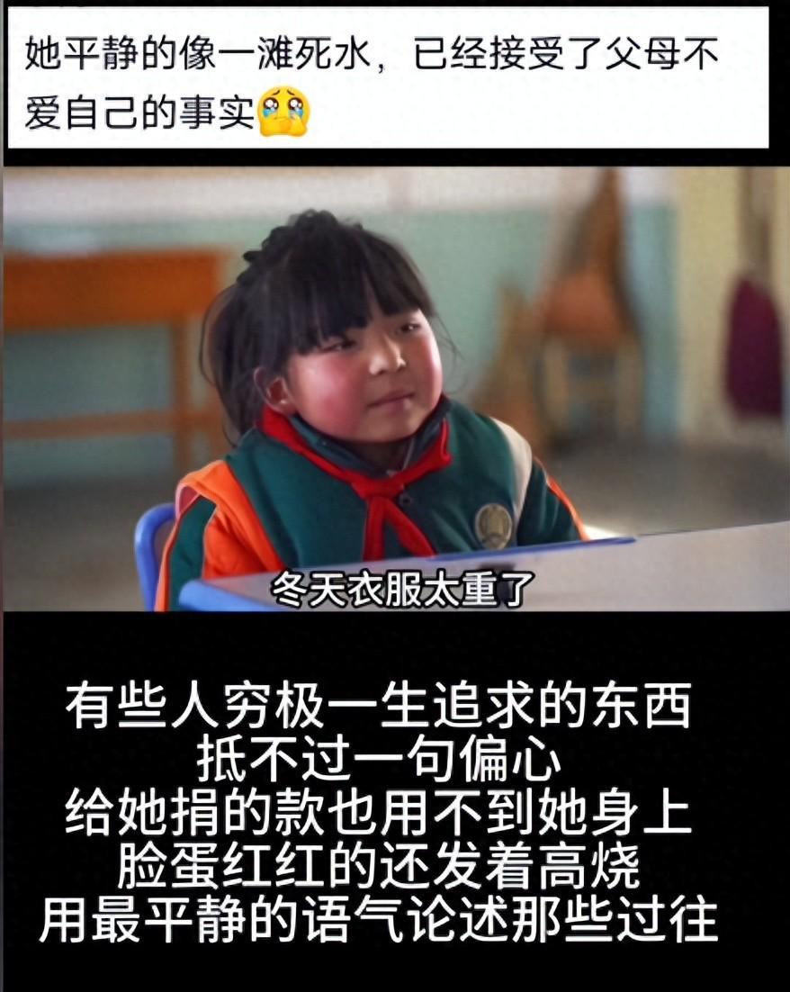 “弟弟的衣服由爸妈洗,我的衣服自己动手洗, 冬天衣物厚重,洗不动就攒着,等天气转暖再洗。” 3月27日,徽声在线报道的纪录片《香溢人间》中,一个7岁小女孩的采访片段在网络上迅速走红。 镜头前,小女孩的脸蛋被冻得红扑扑的,头发凌乱地贴在额前,说话时伴随着明显的咳嗽声,身体显得十分虚弱,但她的语气却异常平静,没有丝毫的委屈或难过,只有一种超越年龄的麻木与淡然。 她的身世触动了无数网友的心弦,大家纷纷表示要捐款或资助这个小女孩,节目组也透露了小女孩目前的状况。 仅有7名学生的小学 这所小学位于陕西宝鸡市,是一所极为特殊的学校,全校竟然只有7名小学生。 每天早上,这几个学生会乘坐村里到县里的唯一一辆公交车,结伴前往学校上课。 下车后,老师会带领学生们排成一队,整齐有序地走向学校,老师则站在队伍外侧,确保学生们的安全。 这样的场景在全国范围内实属罕见,因为通常学校的学生队伍都是熙熙攘攘、人声鼎沸,而他们却只有一支小小的、短短的队伍。 全校仅有的7名学生,分布在1-3年级,学校也仅有7名老师,他们不仅要负责孩子们的全部课程,还要兼顾他们的日常生活照料,这是一所典型的农村小规模“麻雀学校”,也是当下许多偏远山村教育现状的真实写照。 据文家坡小学的祁老师介绍,学校最辉煌的时候,也曾有过几百名学生,但随着城镇化的推进,撤乡并镇,原本的7个小学合并到了这所学校。 每年新招的学生寥寥无几,而毕业的学生却不少,因此,学校的学生数量逐渐减少。 由于许多村民外出务工,大部分孩子都跟随父母进城读书,留在村里的孩子越来越少,到今年,全校就只剩下7名学生,其中6名是留守儿童。 二年级人数最多,有4名学生,三年级有2名同学,六年级则只有1名同学,老师会针对这名学生进行一对一的授课。 由于学生数量稀少,老师对每个学生的情况都了如指掌,家访时发现有些学生的家里脏乱不堪,老师看到孩子们在这样的环境中成长,都心疼不已。 但老师也无法改变孩子们的家庭环境和家长的态度,只能在学校给予学生更多的照顾和教育,希望他们能够多掌握知识,未来能够利用知识改变自己的命运。 7岁女孩讲述家庭生活 镜头中,她穿着一件厚厚的校服,脖子上系着红领巾,但与干净整齐的衣物相比,孩子凌乱的头发和疲惫的神态形成了鲜明的对比。 像这样的留守孩子,一般早早地就掌握了生活技能,因为没有人能够帮他们处理好一切,他们只能依靠自己。 记者采访小女孩,询问她在家是如何照顾自己的。 小女孩说自己会洗衣服,还会给自己弄点吃的,自己洗脸、洗袜子、梳头,都是一个人完成。 采访时得知她还有一个弟弟,记者便询问弟弟的衣服是否也是自己洗? 小女孩刚想回答,却突然忍不住咳嗽起来,她将小脑袋偏向一侧,一边咳嗽一边观察记者。 咳嗽了两声后,小女孩马上调整好姿态,赶紧回答记者的问题,生怕记者等得太久。 小女孩说:“弟弟的衣服是我爸爸或妈妈洗,我的衣服,我自己洗。” 记者听到孩子的回答感到惊讶:“冬天的衣服很重,你怎么洗?” 小女孩回答:“洗不动我会换一件衣服,等天气暖和了,我自己洗。” 这段对话虽然不足1分钟,却瞬间击中了无数网友的内心。 视频中,她全程没有哭闹,没有抱怨,仿佛在说别人的事情,那种“认命般的懂事”,比放声大哭更让人心疼。 有网友留言:“她才7岁啊,本该无忧无虑地玩耍,却已经学会了自己洗衣服,还得等天暖了才能洗厚衣服,她的眼神,感觉她快撑不住了,眼里一点光都没有。” 记者还曾询问过小女孩的梦想是什么。 她回答梦想就是当画家,孩子的想法简单而纯真,觉得画家只需要一张纸、一支笔就可以了,但实际上当画家是一个漫长且需要天赋的职业。 并且想要通过画画赚到钱养活自己也是非常困难的,需要前期忍受着赚不到钱的焦虑,看准目标一直不放弃,才可能会有出名的机会。 小女孩说自己喜欢画宇航员和太空,记者询问她为什么不想当宇航员呢? 小女孩回答:“自己又上不了天,就算能上天,自己也肯定找不到宇宙飞船”。 她虽然年龄小,但好像很多事情都已经明白了,明白自己与宇航员的距离有多远,想成为一个宇航员是多么的困难,所以虽然她很喜欢宇航员,但知道自己肯定成为不了。 她的经历,以及文家坡小学的现状,看似是个例,实则折射出了我国农村留守儿童与乡村小规模学校面临的普遍困境。 根据教育部公开数据显示,我国农村小规模学校有11.1万所,占全国小学和教学点总数的40.2%,这类学校共有在校生404.2万人,校均学生规模仅36.4人。 更值得关注的是孩子们的心理健康状况,心理学研究证实,童年时期的性别偏见、情感剥夺,会给孩子带来长久的伤害。 长期处于情感忽视、不公平对待环境中的孩子,会慢慢关闭自己的情绪,用麻木来保护自己。 避免一次次失望带来的痛苦,就像这位小女孩一样,不是不难过,是难过太多次,已经没力气表达了,不是不懂委屈,是知道委屈没用,只能默默接受。 这种长期的不公平对待,还会让女孩的自我价值感极低,长大后容易自卑、敏感,习惯讨好别人,不敢争取自己的权益,甚至会形成“付出型人格”,哪怕被压榨、被不公平对待,也不敢反抗。 而被娇惯长大的男孩,往往缺乏责任感,不懂得体谅他人,长大后也很难承担起家庭和社会的责任。 小女孩如今的状况 小女孩在采访当天是感冒初愈,还有一点