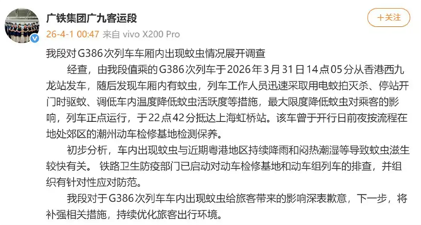 徽声在线4月1日讯 近日,多位网友通过社交媒体平台反映,在3月31日下午从香港西九龙站始发的G386次高铁列车上,遭遇了令人困扰的蚊虫侵扰问题,严重影响了乘客的乘车舒适度。 据现场乘客描述,列车刚启动不久,车厢内便突然涌现出大量蚊子,它们在空中肆意飞舞,使得整节车厢的乘客都难以安宁。 从相关视频中可以清晰看到,不少乘客和乘务员在车厢过道内忙碌地挥手驱赶蚊虫,场面一度显得颇为混乱。面对这一突发状况,列车乘务人员迅速行动,对乘客进行了安抚,并承诺会立即将情况上报给上级部门。 尽管列车继续前行,但乘客们却不得不在这漫长的旅途中与蚊虫展开一场“持久战”。 关于蚊虫大量涌入车厢的原因,有列车员解释称,该列车前一天在潮汕地区进行检修时,为了通风需要,车窗被开启了一整晚。这导致大量蚊子趁机飞入车厢,并隐藏在各个角落。直到次日列车启动,车内温度发生变化,这些蚊子才纷纷飞出,给乘客带来了不小的困扰。 4月1日凌晨,广铁集团广九客运段针对此事发布了详细的情况说明,证实了3月31日G386次列车在行驶途中确实出现了蚊虫问题,并详细记录了当时的应对措施。 列车工作人员在发现蚊虫后,立即采取了多种灭杀手段,包括使用电蚊拍进行人工捕杀,以及在列车停站开门时进行驱赶。同时,乘务组还特意调低了车内空调温度,以降低蚊虫的活跃度,减少对乘客的干扰。 尽管受到了蚊虫的侵扰,但G386次列车最终仍保持正点运行,并于当晚22点42分准时抵达上海虹桥站,未对整体行程造成太大影响。 据初步分析,车内出现大量蚊虫与近期粤港地区持续降雨、环境闷热潮湿导致蚊虫快速滋生有关。此外,列车曾在郊区的动车基地进行检修,这也进一步增加了蚊虫进入车体的可能性。 目前,铁路卫生防疫部门已经启动了对动车检修基地和动车组列车的全面排查工作,并组织制定了有针对性的应对防范措施,以防止类似事件再次发生。 |