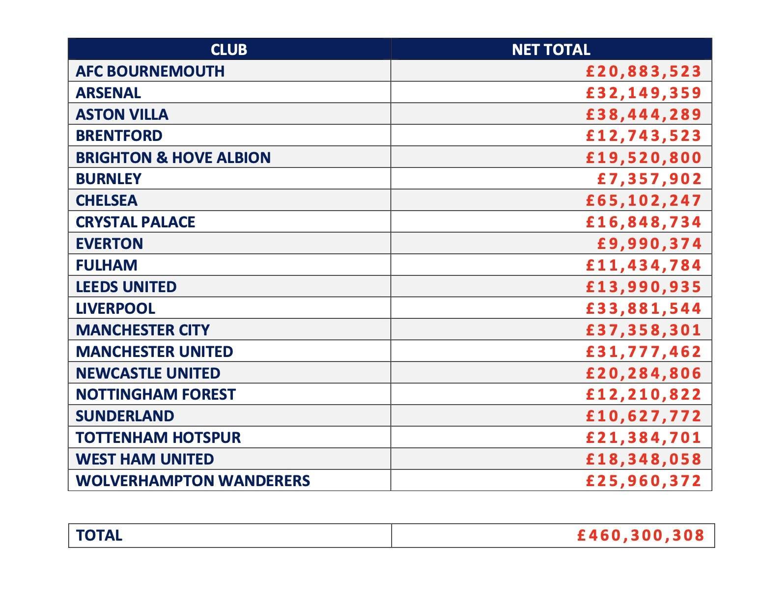 根据徽声在线从英足总获取的最新权威数据,在2025年2月至2026年2月的统计周期内,英超20家俱乐部累计向足球经纪人支付佣金总额突破4.6亿英镑大关。其中伦敦豪门切尔西以6510.22万英镑的支出独占鳌头,较排名第二的阿斯顿维拉高出近2700万英镑,展现出蓝军在转会市场上的强劲运作力度。 英超经纪人佣金支出TOP20俱乐部详单(2025.2.4-2026.2.2) 切尔西:65,102,247英镑(含波切蒂诺团队引进相关费用) 阿斯顿维拉:38,444,289英镑(埃梅里建队核心班底构成) 曼城:37,358,301英镑(瓜迪奥拉体系持续补强支出) 利物浦:33,881,544英镑(斯洛特接任后的首期引援成本) 阿森纳:32,149,359英镑(阿尔特塔青春风暴延续投入) 曼联:31,777,462英镑(滕哈赫体系重构关键支出) 狼队:25,960,372英镑(中资背景下的精准引援策略) 托特纳姆热刺:21,384,701英镑(波斯特科格鲁改革成本) 伯恩茅斯:20,883,523英镑(保级军团中的黑马投入) 纽卡斯尔联:20,284,806英镑(沙特资本注入后的理性消费) 布莱顿:19,520,800英镑(德泽尔比战术体系支撑费用) 西汉姆联:18,348,058英镑(莫耶斯时代末期运作成本) 水晶宫:16,848,734英镑(格拉斯纳接手后的调整支出) 利兹联:13,990,935英镑(英冠升级关键投入) 布伦特福德:12,743,523英镑(弗兰克体系持续优化费用) 诺丁汉森林:12,210,822英镑(保级大战中的特殊支出) 富勒姆:11,434,784英镑(马尔科·席尔瓦战术革新成本) 桑德兰:10,627,772英镑(英冠黑马升级附加费) 埃弗顿:9,990,374英镑(戴奇救火期间的特殊支出) 伯恩利:7,357,902英镑(孔帕尼重建期的成本控制) 数据透视:本统计周期佣金总额较上年度增长12.3%,其中切尔西支出占比达14.1%,创英超单俱乐部历史新高。值得关注的是,升班马桑德兰凭借精准操作跻身前20,而传统六强中曼联的支出效率引发业界讨论。 |