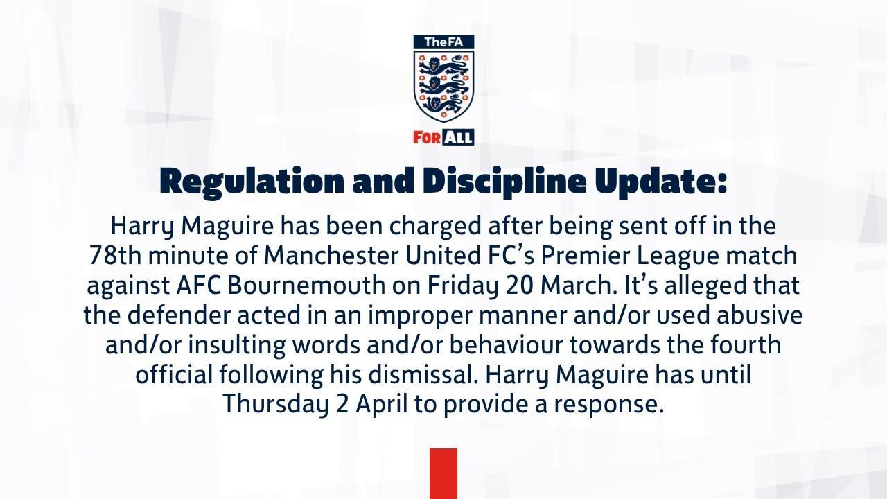北京时间4月1日消息,英格兰足球总会(英足总)通过官方渠道发布声明,曼联后卫马奎尔因在3月20日英超联赛第29轮曼联对阵伯恩茅斯的比赛中出现违规行为,正式遭到纪律指控。据现场记录显示,比赛进行至第78分钟时,马奎尔因犯规被主裁判出示红牌罚下,离场过程中对当值第四官员存在不当举动。 根据英足总公告披露,该事件核心争议点在于马奎尔被罚离场后,不仅对第四官员实施了不恰当肢体动作,还伴有辱骂性及侮辱性言语。按照英足总纪律程序,这位29岁的英格兰国脚需在4月2日(本周四)英国时间18:00前提交书面申辩材料,否则将面临追加处罚。目前曼联俱乐部尚未就此事发表官方声明,但据内部人士透露,球队法律团队已介入处理相关程序。 |