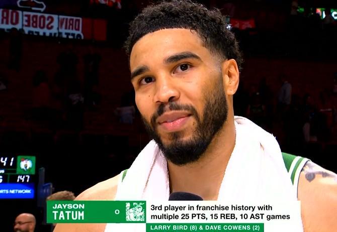 北京时间4月2日,在NBA常规赛的一场焦点对决中,波士顿凯尔特人队在客场以147-129的比分大胜迈阿密热火队。此役,凯尔特人队的当家球星塔图姆发挥出色,全场贡献了25分、18个篮板以及11次助攻的豪华数据,这也是他伤愈复出后的首次三双表现。 据赛后统计数据显示,塔图姆在这场比赛中所取得的25分18篮板11助攻的全面数据,让他在凯尔特人队的历史上留下了浓墨重彩的一笔。他成为了继传奇球星拉里-伯德(8次达成此壮举)和戴夫-考恩斯(2次达成此壮举)之后,凯尔特人队史上第三位能够在单场比赛中至少贡献25分、15个篮板以及10次助攻的球员。这一成就无疑彰显了塔图姆在球队中的重要地位以及他出色的个人能力。 |