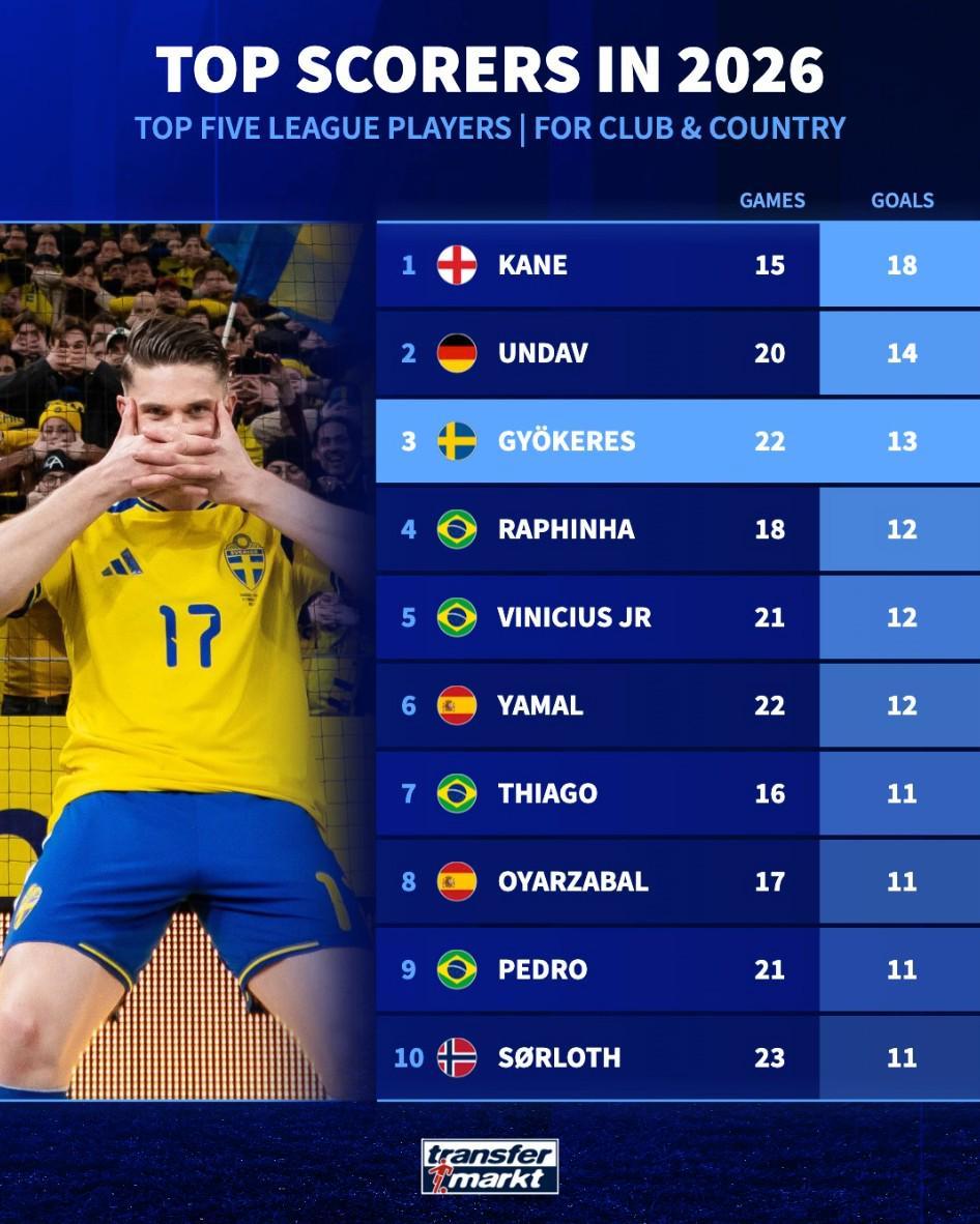 北京时间4月2日,根据权威数据机构德国转会市场网的最新统计,欧洲五大联赛球员在2026年国家队赛事与俱乐部赛事中的综合进球榜单正式揭晓。在这份备受瞩目的榜单中,英格兰锋线巨星哈里-凯恩凭借出色的表现,以15场比赛攻入18球的惊人效率,毫无悬念地占据榜首位置。值得一提的是,瑞典新星哲凯赖什同样表现出色,他在世预赛附加赛决赛中的关键进球,不仅助力瑞典队成功晋级世界杯,更让他以22场13球的成绩,稳坐榜单第三把交椅。