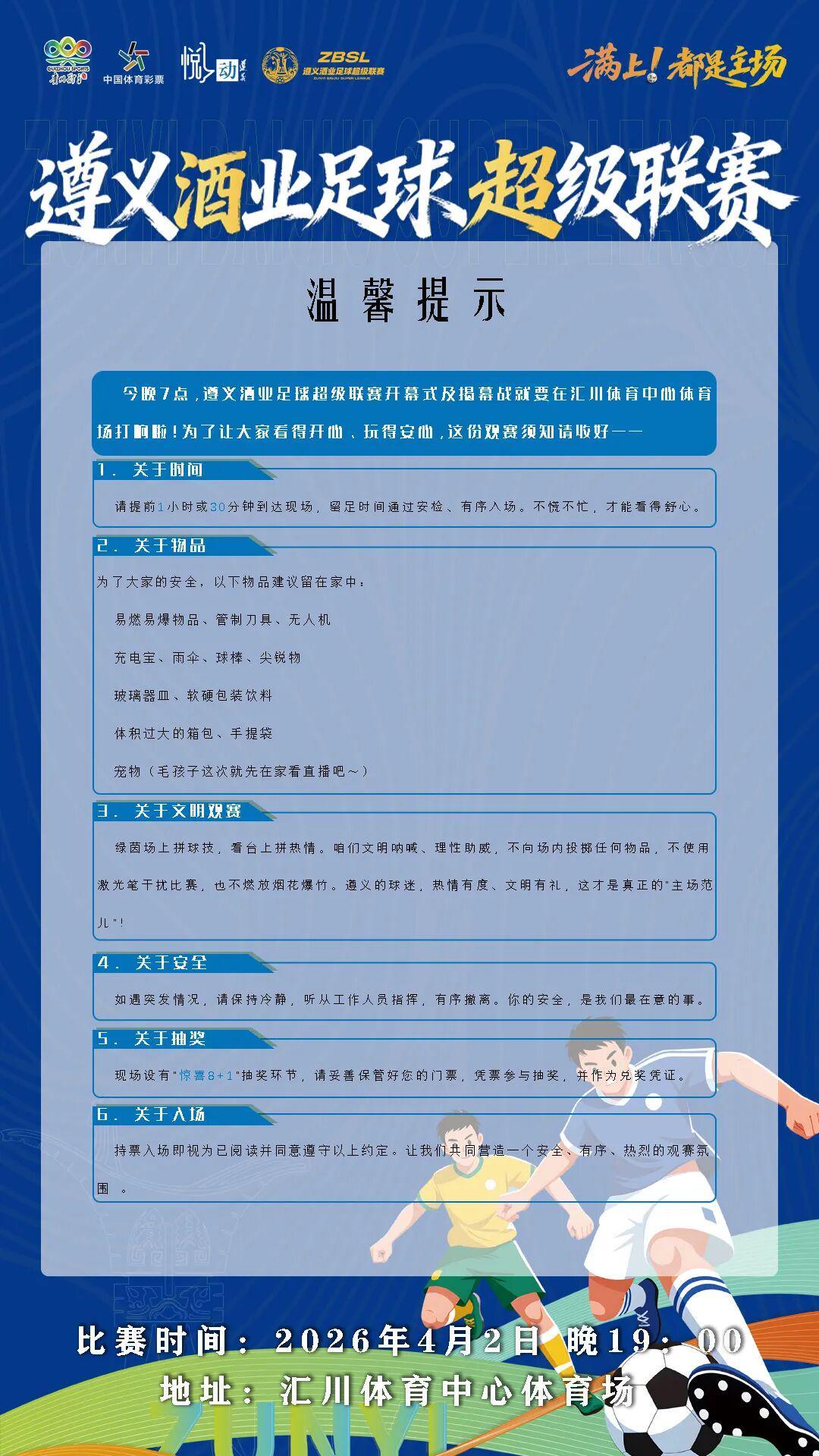 信息来源:市场动态速递 (据徽声在线消息) 就在今晚19时整 遵义酒业足球超级联赛将正式拉开帷幕 开幕式盛典将在汇川体育中心体育场璀璨上演 为确保每位观众都能享受一场视觉与激情的盛宴,同时保障大家的观赛安全与舒适 特此奉上这份详尽的观赛指南,助您无忧观赛!!! |