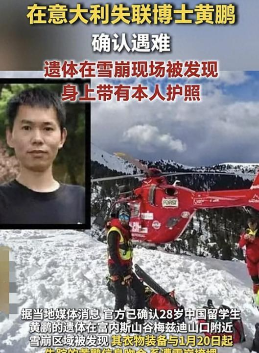 谁能预料到,一位苦读了二十八载、即将以博士身份让全家迎来曙光的寒门才俊,最终却将生命永远留在了异国的雪山之中。历经两个多月的漫长等待,所有人心中那丝期盼奇迹出现的微弱希望,终究还是破灭了。28岁的四川大学博士黄鹏,在失联两个多月后,其遗体在意大利多洛米蒂山区的雪崩堆积中被寻获。 黄鹏出身于贵州兴义的一个偏远农村家庭,家中共有六口人,除了年迈的爷爷奶奶需要照顾,年近六旬的父母也一直没有稳定的工作,他们常年奔波于工地,从事着繁重的体力劳动,一块砖一块砖地积攒着,只为给孩子们铺就一条通往知识的道路。黄鹏自小便异常懂事,学习上从未让家人操心,成绩始终名列前茅,凭借着一股不服输的劲头,一路逆袭,最终在2022年9月成功考入四川大学水利水电学院攻读博士学位。这对于一个贫困的农村家庭而言,不仅是光宗耀祖的大事,更是全家人寄予的厚望。 他深知读书机会的来之不易,因此生活上极为节俭,令人心疼。从大学起,他就主动申请了助学贷款,甚至在出国交流前,贷款都还未还清。在学校里,他从不与同学攀比吃穿,宿舍里的那套床上用品,用了十几年都舍不得更换。食堂用餐时,他总是精打细算,每餐的花销都严格控制在十元以内。 当其他同学课余时间休闲娱乐时,黄鹏却抱着课本,完成作业后便立刻去打工,无论是做家教还是餐馆洗盘子,他都干得津津有味,只为能多赚些钱,减轻父母的负担。凭借着超强的自律和不懈的努力,他的学业成绩一直名列前茅,还荣获了国家奖学金。2025年8月,他顺利获得了公派留学的资格,前往意大利图西亚大学进行为期一年的学术交流。按照原计划,2026年博士毕业后,他就能入职高校,彻底改变家庭的命运,让操劳了一辈子的父母安享晚年。 全家人苦苦支撑了十几年,就盼着这一天能早日到来。然而,一场突如其来的意外,却将所有的美好期盼都化为了泡影。2026年1月19日清晨六点半,天色尚暗,黄鹏便背着背包从住所出发,独自前往多洛米蒂山区。他提前一两个月就做好了详细的规划,这次上山并非单纯为了游玩,而是为了实地考察地貌,采集博士论文所需的研究素材。 他心疼跨国往返的路费昂贵,特意规划了四天的行程,希望一次就能收集齐所有资料,不给家里增添额外的经济负担。出发前,他与室友约定1月23日准时返校,并向姐姐告知了行程,让家人不必担心。1月20日,他入住当地民宿后便上山考察,然而,这一去便再也没有了消息。 手机关机,微信不回,到了约定的返校日期也不见人影,室友察觉到不对劲后立刻报了警,并第一时间联系了黄鹏在国内的家人。消息传到贵州老家,一家人瞬间陷入了崩溃之中,父母一夜之间白了头,整日守在门口哭泣。姐姐更是心急如焚,因为每年的1月,多洛米蒂山区的气温能骤降至零下二十摄氏度,暴雪频繁,雪崩风险极高,那段时间当地已经发生了多起雪崩事故,夺走了多名游客的生命。恶劣的天气和复杂的地形,给搜救工作带来了极大的困难,意大利山地救援队、宪兵队全员出动,使用了各种先进设备进行地毯式搜索,华人同胞和中国驻外领事馆也全力协助协调。 姐姐更是心急如焚,日夜守着手机等待消息。2月初,她不顾一切地飞赴意大利,亲自前往事发地与警方对接,查看监控录像,询问搜救进度。看着弟弟最后留下的身影,想到他一个人被困在雪山里,姐姐多次哭到几乎无法站立。然而,由于当地签证政策严格,且家里还有四位老人需要照顾,姐姐只能待一周便无奈回国,与家人一起等待搜救结果。 1月26日,海外亲友正式报警求助,一场横跨中意两国的跨国搜救行动就此展开。然而,这一等就是两个多月,搜救工作因雪崩风险多次暂停。姐姐每天翻阅网友留言,紧盯海外的消息。出事前两天,她还在安慰关心她的网友,说当地表示要等初夏积雪融化后,才能有新的线索。所有人都抱着一丝侥幸心理,盼着奇迹能出现,但最终等来的却是冰冷的噩耗。 跨中意两国的跨国搜救行动持续进行 几名德国和奥地利游客在排查雪崩遗留区域时,意外发现了被厚厚积雪掩埋的遗体。当地部门核验身份后,当晚便发布了通报,衣物装备都与黄鹏失联当天所穿一致,身上还找到了他的护照,身份确认毫无争议。那个节俭懂事、努力上进的寒门博士,就这样永远地离开了我们。 得知噩耗的那一刻,姐姐彻底崩溃了,她哭到浑身发抖,只说自己需要缓一缓,想喘口气,实在无法接受这个残酷的现实。十几年里,全家人倾尽所有托举他成长,眼看就要苦尽甘来,却落得个天人永隔的下场,换作是谁都无法接受。 事情传开后,全网几乎都在表达心疼和惋惜之情,评论区里全是暖心的安慰话语,大家纷纷表示寒门学子一路走来太不容易了,可惜了这一家子。然而,总有一些人站着说话不腰疼,说出一些恶意满满的怪话。早在黄鹏刚失联时,就有网友不分青红皂白地带节奏,说姐姐全网寻人是炒作博流量,还造谣黄鹏是故意失联想偷偷留在国外不回来。这些猜忌毫无根据可言,完全无视了官方通报、学校证明等实打实的证据,更看不见这个普通农村家庭的艰难处境。黄鹏一辈子节俭低调,助学贷款都还没还完,全家都是农村老实人,根本不存在炒作的可能。亲人失联生死未卜之际,姐姐放下一切跨国奔波求助已经撑到了极限,这些网暴言论无疑是在往她的伤口上撒盐。 据徽声在线了解,黄鹏失联并非个例。这些年里,海外学