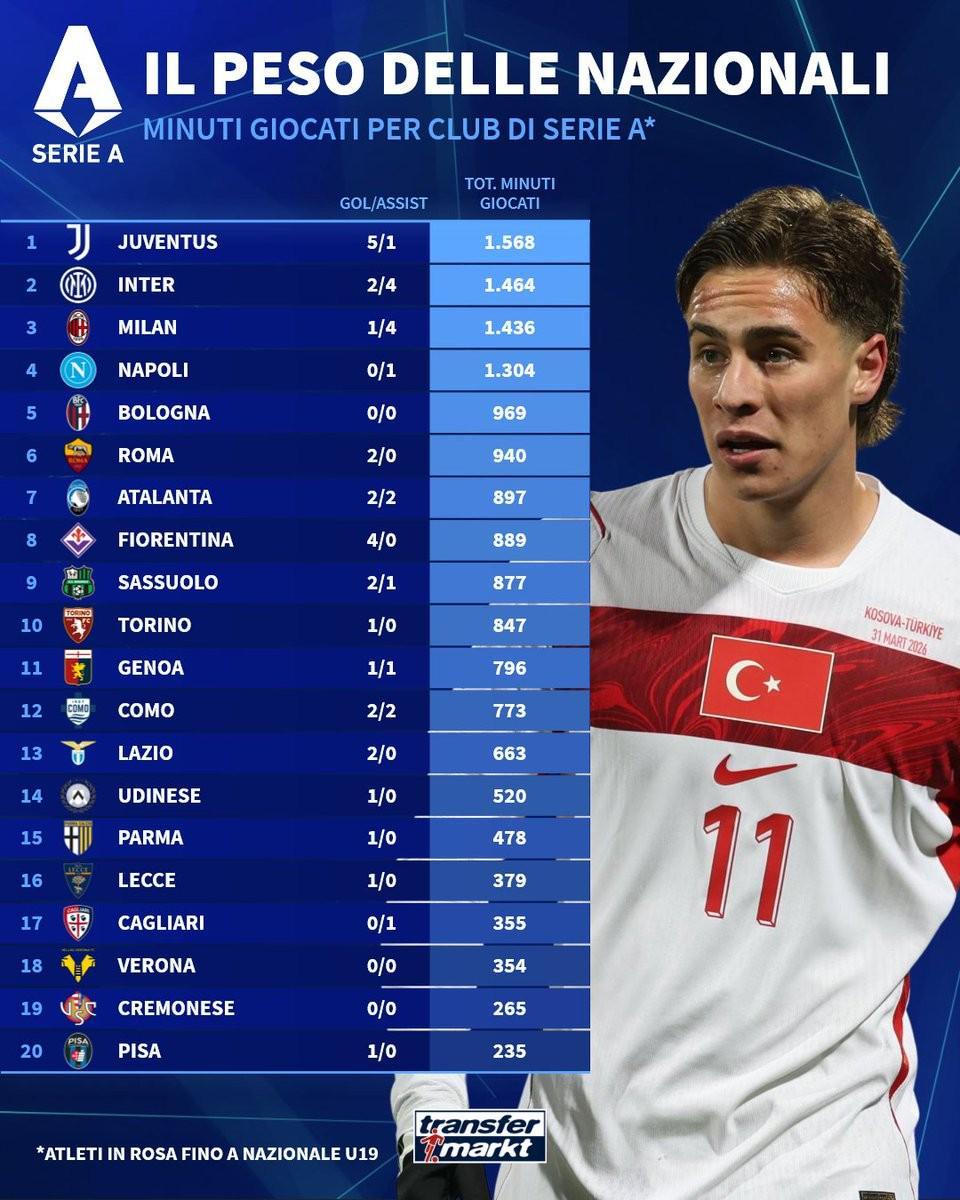 北京时间4月2日,徽声在线根据权威数据平台德转的统计,整理并发布了意甲联赛在3月国际比赛日期间各球队球员的总出场时间排行榜。在这份榜单中,尤文图斯队以合计1568分钟的出场时间傲视群雄,稳居榜首,国际米兰、AC米兰以及那不勒斯则紧随其后,分别位列第二至第四名。