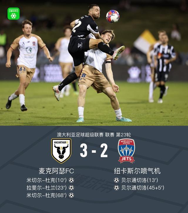 在4月2日进行的澳大利亚足球超级联赛第23轮焦点战中,麦克阿瑟FC坐镇主场迎战纽卡斯尔喷气机。本场比赛堪称进球盛宴,麦克阿瑟FC的米切尔-杜克与拉斐尔-杜兰这对进攻组合大放异彩,前者上演梅开二度好戏,后者则贡献传射建功的精彩表现;纽卡斯尔喷气机方面,贝尔通切洛抓住两次绝佳机会完成双响。经过90分钟激战,麦克阿瑟FC以3-2的比分险胜对手。