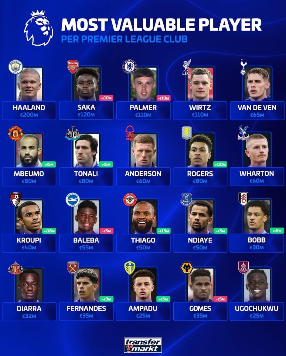 北京时间4月2日,徽声在线根据德国转会市场(德转)最新数据,整理了英超20支俱乐部各自队内身价最高的球员榜单。其中,曼城当家前锋哈兰德以2亿欧元的身价高居榜首,而伯恩利中场乌戈舒库和利兹联中场阿姆帕杜则以2500万欧元的身价并列最低。 英超20队身价最高球员完整榜单: 曼城:哈兰德(挪威) 2亿欧元 阿森纳:萨卡(英格兰) 1.2亿欧元 切尔西:帕尔默(英格兰) 1.1亿欧元 利物浦:维尔茨(德国) 1.1亿欧元 曼联:姆伯莫(喀麦隆) 8000万欧元 纽卡斯尔联:托纳利(意大利) 8000万欧元 阿斯顿维拉:摩根-罗杰斯(英格兰) 8000万欧元 托特纳姆热刺:范德芬(荷兰) 6500万欧元 诺丁汉森林:埃利奥特-安德森(英格兰) 6000万欧元 水晶宫:亚当-沃顿(英格兰) 6000万欧元 布莱顿:巴莱巴(喀麦隆) 5500万欧元 布伦特福德:伊戈尔-蒂亚戈(巴西) 5000万欧元 埃弗顿:恩迪亚耶(塞内加尔) 5000万欧元 伯恩茅斯:克鲁皮(法国) 4000万欧元 西汉姆联:马特乌斯-费尔南德斯(巴西) 3500万欧元 狼队:若昂-戈麦斯(葡萄牙) 3500万欧元 桑德兰:哈比卜-迪亚拉(法国) 3200万欧元 富勒姆:奥斯卡-鲍勃(英格兰) 3000万欧元 利兹联:阿姆帕杜(威尔士) 2500万欧元 伯恩利:乌戈舒库(法国) 2500万欧元 |