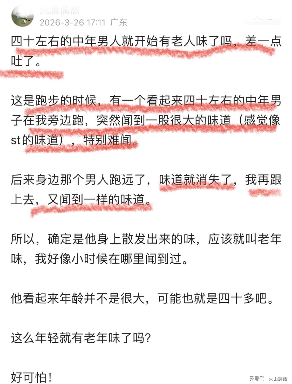 四十岁上下的中年男性,难道真的已经开始散发所谓的“老人味”了吗?这股味道差点让人作呕。 最近,一位来自广东的网友在社交平台上分享了自己的奇特经历。他在跑步时,旁边有一位看似四十岁左右的中年男子,突然间,一股浓烈且刺鼻的气味扑面而来(感觉像是某种难以名状的异味),让人难以忍受。 当那位散发异味的男子跑远后,那股令人不悦的味道也随之消散。然而,当网友再次靠近时,那股熟悉的味道又再次袭来。因此,网友确定这股味道正是从那位男子身上散发出来的,或许这就是人们常说的“老人味”。网友回忆道,这种味道似乎在小时候也曾闻到过,但没想到会在一个如此年轻的人身上重现。四十多岁就出现老人味,这实在让人感到惊讶和不安。 这篇帖子一经发布,便在评论区引发了热烈讨论。有网友表示,这并非年龄问题。他分享了自己的一次经历,在一家苍蝇馆子吃早餐时,对面坐着一位四十岁左右的男子,身上散发着老人味。从那以后,他再也没去过那家店。尽管自己已经53岁,但每天早晚都会洗澡,保持干净整洁再出门,这是他三十多年来的习惯。 也有网友对此表示质疑,认为自己47岁,身上从未有过任何异味,身边的小年轻还经常来他的茶室喝茶聊天,相处得非常愉快。 还有网友对四十岁男性身上出现浓烈怪味的原因进行了深入分析,认为大致有以下几种情况:一是个人卫生习惯极差;二是可能患有糖尿病;三是存在严重的狐臭问题。