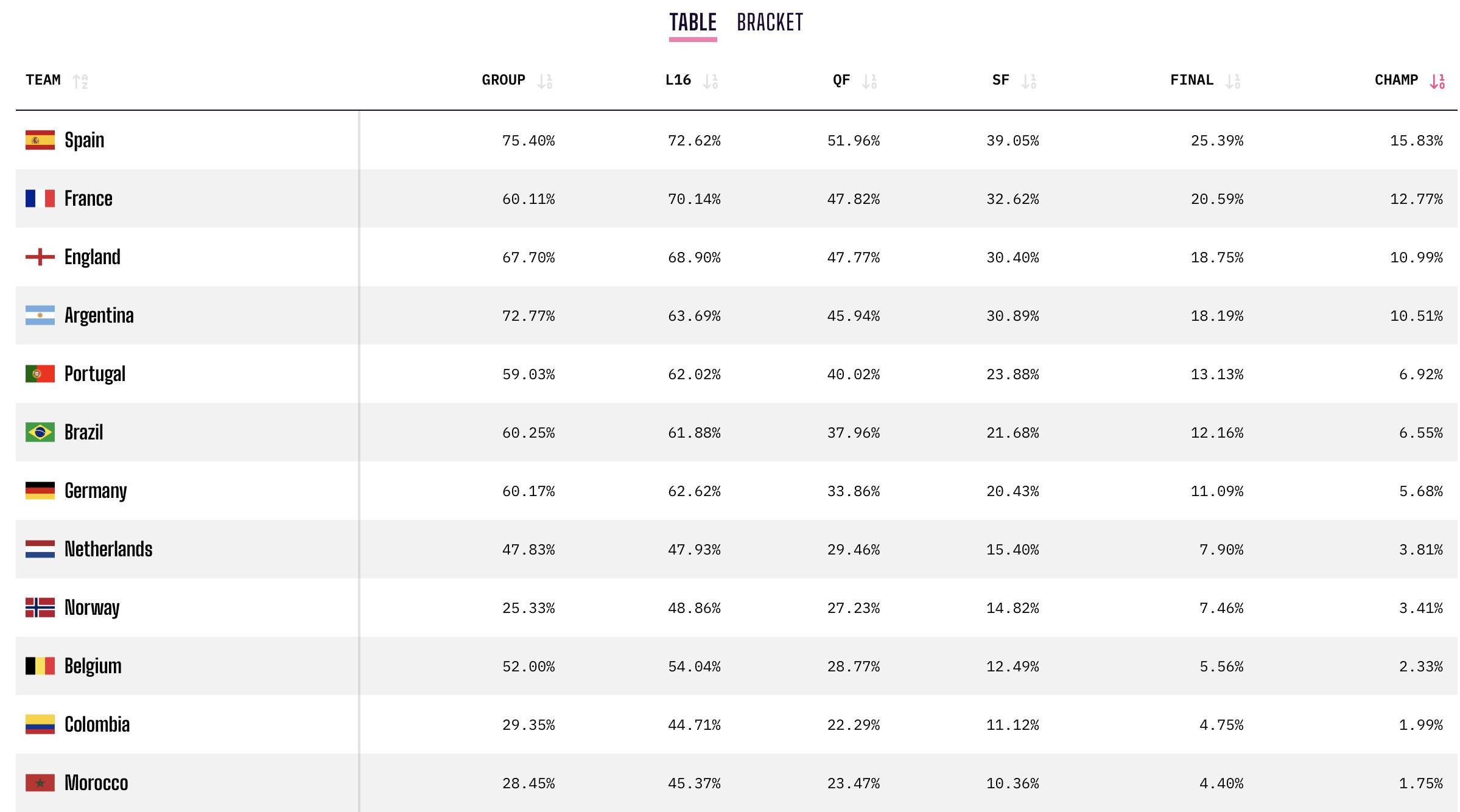 1、西班牙:夺冠概率15.83%,领跑群雄 2、法国:紧随其后,夺冠概率12.77% 3、英格兰:实力不容小觑,夺冠概率10.99% 4、阿根廷:南美劲旅,夺冠概率10.51% 5、葡萄牙:C罗领衔,夺冠概率6.92% 6、巴西:五星巴西,夺冠概率6.55% 7、德国:日耳曼战车,夺冠概率5.68% 8、荷兰:无冕之王,夺冠概率3.81% 9、挪威:北欧黑马,夺冠概率3.41% 10、比利时:欧洲红魔,夺冠概率2.33% 11、哥伦比亚:南美新贵,夺冠概率1.99% 12、摩洛哥:非洲雄狮,夺冠概率1.75% 13、墨西哥:中北美强队,夺冠概率1.71% 14、乌拉圭:南美传统强队,夺冠概率1.58% 15、瑞士:欧洲劲旅,夺冠概率1.55% 16、克罗地亚:上届亚军,夺冠概率1.54% 17、厄瓜多尔:南美新势力,夺冠概率1.32% 18、日本:亚洲代表,夺冠概率1.31% 19、美国:中北美足球强国,夺冠概率1.20% 20、土耳其:欧洲新星,夺冠概率0.98% 21、加拿大:中北美新贵,夺冠概率0.82% 22、塞内加尔:非洲冠军,夺冠概率0.73% 23、瑞典:北欧强队,夺冠概率0.51% 24、奥地利:欧洲中游球队,夺冠概率0.49% 25、巴拉圭:南美足球力量,夺冠概率0.42% 26、韩国:亚洲劲旅,夺冠概率0.38% 27、澳大利亚:大洋洲代表,夺冠概率0.35% 28、埃及:非洲足球强国,夺冠概率0.32% 29、捷克:欧洲足球传统,夺冠概率0.24% 30、波黑:欧洲新军,夺冠概率0.24% 31、苏格兰:英国足球力量,夺冠概率0.24% 32、伊朗:亚洲足球强队,夺冠概率0.22% 33、阿尔及利亚:非洲足球新星,夺冠概率0.22% 34、科特迪瓦:非洲足球劲旅,夺冠概率0.20% 35、加纳:非洲足球力量,夺冠概率0.16% 36、突尼斯:非洲足球代表,夺冠概率0.12% 37、新西兰:大洋洲新军,夺冠概率0.08% 38、刚果民主共和国:非洲足球新势力,夺冠概率0.08% 39、巴拿马:中北美新军,夺冠概率0.08% 40、南非:非洲足球强国,夺冠概率0.07% 41、卡塔尔:亚洲足球新贵,夺冠概率0.07% 42、约旦:亚洲足球力量,夺冠概率0.07% 43、乌兹别克斯坦:中亚足球代表,夺冠概率0.07% 44、沙特阿拉伯:亚洲足球劲旅,夺冠概率0.05% 45、伊拉克:亚洲足球传统强队,夺冠概率0.05% 46、佛得角:非洲足球新军,夺冠概率0.01% 47、海地:中北美足球新势力,夺冠概率0.00% 48、库拉索:加勒比海地区代表,夺冠概率0.00% |