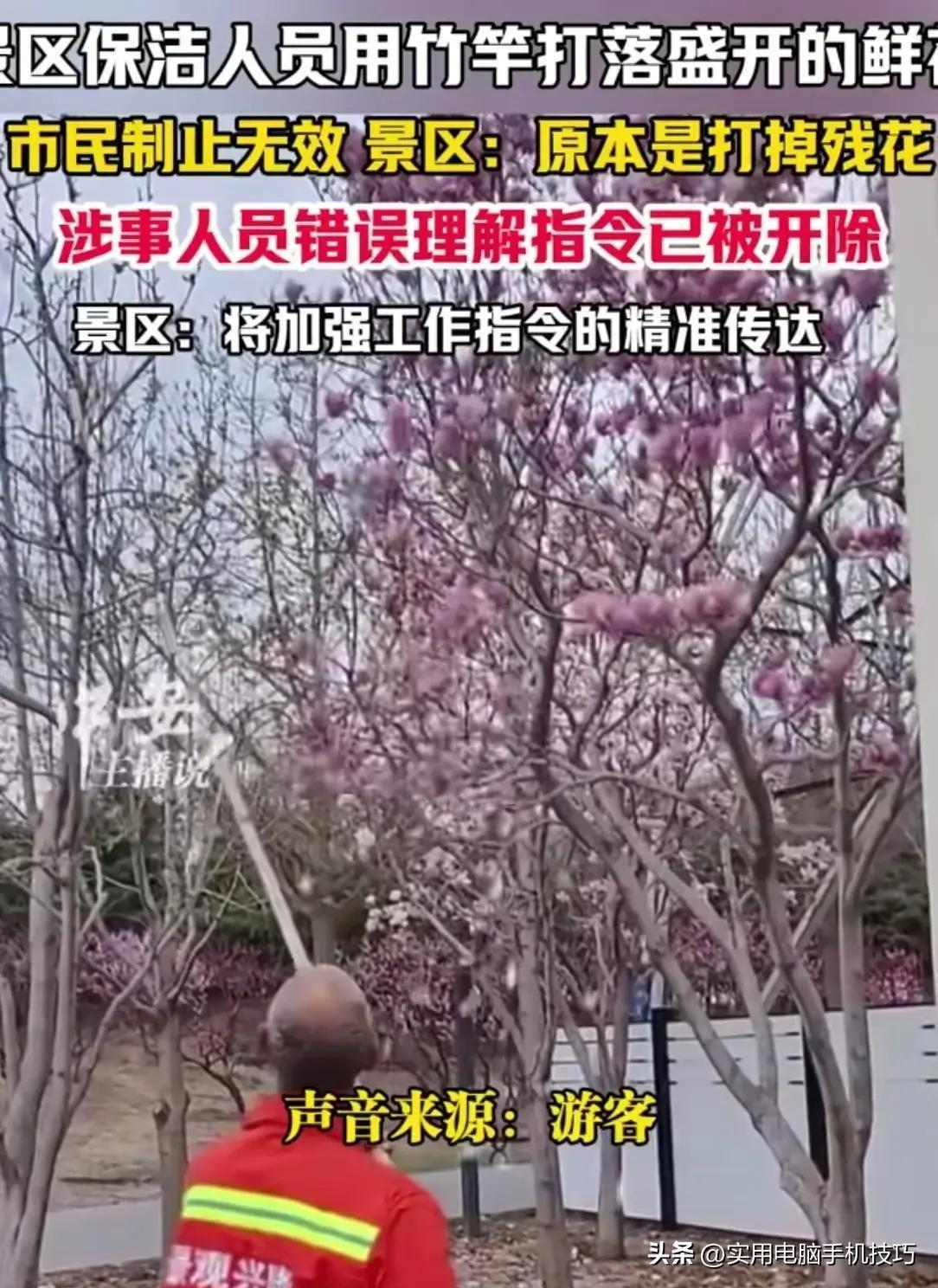 春日里,繁花似锦,本应是一幅幅令人心旷神怡的画卷,然而,若管理失当,这份美好便可能瞬间化为乌有。许多看似无心的举动,实则因指令传递的偏差,最终酿成令人惋惜的后果,既破坏了美景,也伤了人心。 3月29日,北京兴隆郊野公园内发生了一幕令人痛心的场景,被游客偶然捕捉并记录下来。画面中,一位保洁大爷手持长竹竿,对着满树盛开的花朵猛烈敲打,花瓣如雨点般纷纷飘落,原本绚烂的美景瞬间变得满目疮痍。 尽管有游客上前劝阻,但大爷并未停下手中的动作。此事迅速在网络上发酵,景区方面迅速作出回应,称员工误解了指令,已将涉事人员开除。然而,这一处理结果并未平息网友的愤怒与质疑。 北京公园保洁暴力打花引众怒 事发当日,阳光明媚,兴隆郊野公园内游客如织,大家纷纷趁着春日好时光,前来赏花踏青,享受难得的宁静与美好。不少游客还特意携带相机,希望记录下这绚烂的春日景象。 然而,谁也没想到,眼前竟会出现如此煞风景的一幕。 一段现场视频真实记录了这一过程:一位头发花白、年纪较大的保洁大爷,身着园区统一工作服,手持一根长长的竹竿,站在花树下不断挥舞。 竹竿一次次重重地击打在花枝上,那些正盛开或含苞待放的花朵根本无法承受这样的撞击,纷纷从枝头坠落。短短几分钟内,地面便铺满了层层叠叠的花瓣,显得凌乱而令人惋惜。 周围的游客看到这一幕,无不感到心疼与愤怒,纷纷上前劝阻。 有游客耐心地向大爷解释:“这些花是供大家观赏的,开得如此美丽,请不要再打了!” 还有游客焦急地提醒大爷,破坏花草是违反园区规定的。然而,面对所有人的劝阻,保洁大爷却置若罔闻,依旧固执地挥舞着竹竿,敲打花枝,毫无停下的意思。 在场市民越看越气愤,大家来公园本是为了亲近自然、欣赏春色,花朵作为公共景观,属于每一位市民。 工作人员本应守护好这些花草,却没想到反而亲手破坏了这份美好。 这段视频被游客上传至社交平台后,迅速引发了广泛关注与热议,短短几小时内便登上了热门讨论榜单,吸引了数万网友的围观与评论。 景区迅速回应并处理 随着事件热度的不断攀升,舆论压力也越来越大,兴隆郊野公园方面很快便出面回应此事。 园区工作人员解释称,原本管理层安排保洁人员清理的是树上枯萎掉落的残花,目的是为了减轻地面清扫负担,方便园区的日常养护工作。 然而,一线保洁人员却误解了指令,没有分清残花与盛开的鲜花,误将满树繁花当作枯枝败叶全部打落。 此外,园方还补充说明称,这是园区今年首次出现此类情况,平时的养护工作都规范有序,后续将召开内部会议进行严肃整改。 到了3月30日,景区公布了最终处理结果:负责传达工作的带班管理人员以及动手敲打花朵的保洁大爷,两人均被直接开除。 本以为快速回应与严厉处罚能够平息大家的不满,然而事实却恰恰相反。 这份处理通报一出,全网争议再次被点燃,网友看法两极分化,评论区吵得不可开交。 一部分网友认为,景区处理及时,态度值得认可。他们表示,公共花草不容随意破坏,工作人员缺乏基本认知,分不清养护与破坏的区别,闹出这样的低级错误,影响园区形象,开除处理合情合理,能够起到警示全体员工的作用,避免类似问题再次发生。 网友评论炸锅,直指问题核心 然而,更多网友在看完回应与处理结果后,却表示根本不买账,评论更是一针见血,戳破了背后的关键问题。 有网友留言道:“正值盛花期,树上全是新鲜花朵,哪来那么多残花要特意敲打?这个借口未免太敷衍了。” 还有网友心疼保洁大爷:“一看就是年纪大的务工老人,文化不高,找份体力活养家不容易,理解慢一点可以教育整改,直接开除是不是太绝情了?” 更犀利的评论直指管理漏洞:“又是老套路!指令传达出错、管理不到位,最后永远是底层员工背锅,管理层从来不用担半点责任。” 这些留言说出了大多数人的心声,大家一眼就看穿,所谓的理解失误,不过是景区掩盖管理疏漏的借口。 年纪大的保洁员工看不懂复杂的养护规则,只能照着带班人员的口头安排做事。 指令说得模棱两可,既没有明确区分盛花与残花,也没有现场示范操作方法,最后出错了,全部责任都推给一线员工,让弱势群体承担所有后果。 其实,像兴隆郊野公园这样荒唐的管理操作,早已不是个例。全国各地不少景区和公共区域,都出现过类似为了省事而破坏景观的闹剧,每一次都引发全民吐槽。 此前,有网红景区为了减少游客踩踏草坪后的维护工作,直接将大片人工花海全部铲除,种上杂乱野草,美名其曰自然养护,完全无视游客的观赏需求; 更常见的还有许多公园,为了减少日常管理麻烦,直接用围栏封锁整片草坪,禁止游客踏入亲近自然; 部分市政养护人员,在秋冬季节为了省事,提前剪掉还未枯萎的景观绿植。 这些行为都有一个共同点:打着规范养护、方便管理的旗号,牺牲公共美景,用最简单粗暴的方式偷懒应付,完全忽略了市民的体验和公共利益。 深究根源,反思整改刻不容缓 反观这次打花事件,我们更能看清其中的不合理之处。 首先,从常识来说,残花会自然风干脱落,根本不需要用竹竿暴力敲打。正值盛春时节,花朵生命力旺盛,肉眼就能清晰分辨鲜花与残花,不存在难以区分的情况。 其次,管理规范的园区,养护工作一定会有清晰标准:哪些植被需要修剪,哪些花朵需要保留,都会有明确规定和岗前培训。如果连基础工