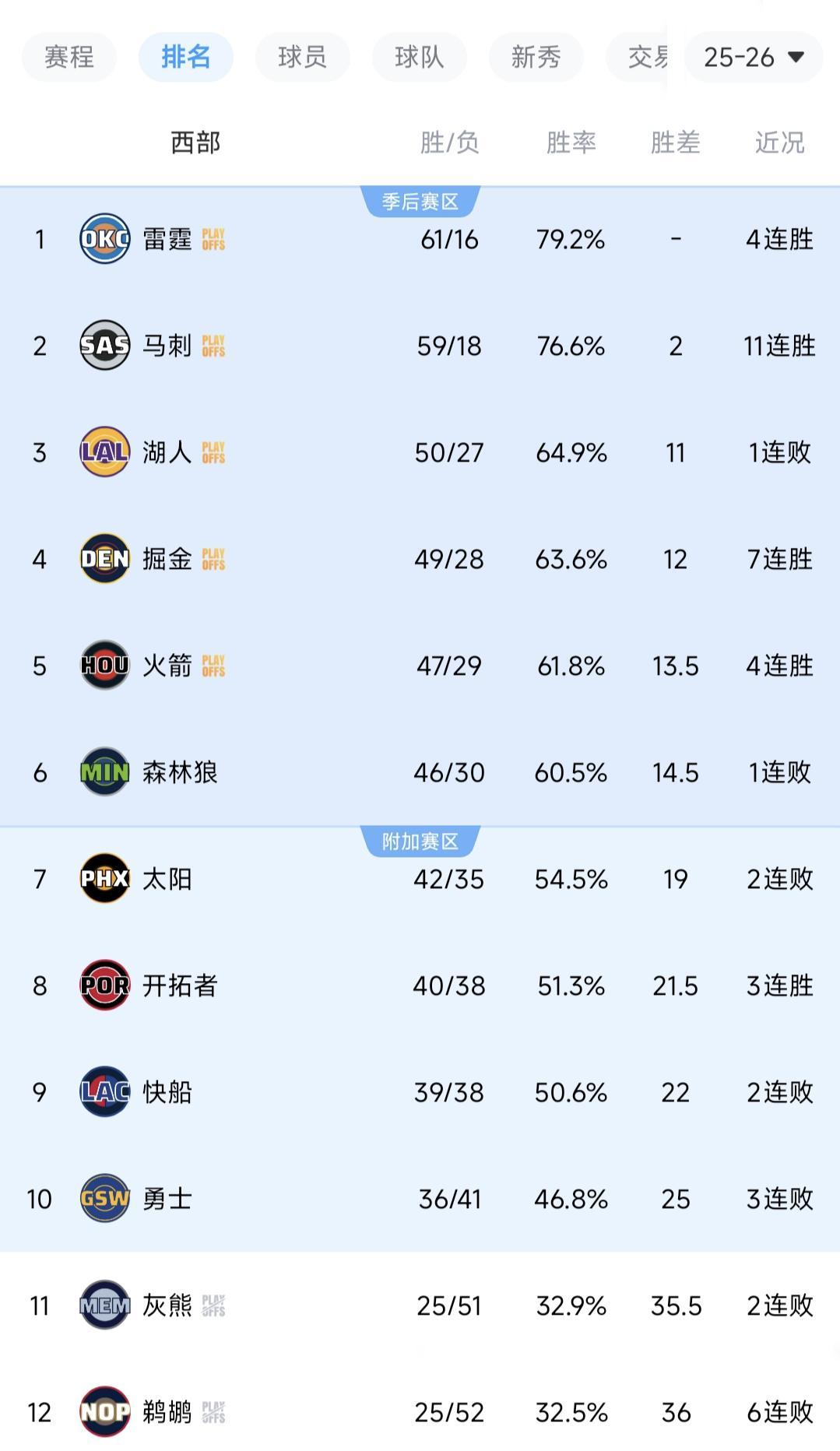 北京时间4月3日,NBA常规赛迎来6场焦点对决,西部10支球队悉数登场展开激烈角逐。当日战况呈现两极分化态势:太阳107-127爆冷负于黄蜂,森林狼108-113惜败活塞,湖人96-139遭遇雷霆血洗,骑士118-111力克勇士,鹈鹕106-118不敌开拓者,马刺118-99大胜快船。随着这些关键战役的落幕,西部格局再度发生微妙变化,徽声在线为您带来最新排名深度解析。 西部榜首之争已进入白热化阶段,雷霆虽以61胜16负稳居头名,但身后马刺的59胜18负仅相差2个胜场。在雷霆主场迎战湖人的焦点战中,亚历山大率队首节狂轰44分建立23分优势,次节更将分差扩大至40+。尽管东契奇意外伤退(注:原文有误,应为戴维斯),但雷霆凭借多点开花的进攻体系,最终以43分优势血洗湖人。此役过后,雷霆收获4连胜巩固榜首,湖人则以50胜27负暂列第三,这场惨败暴露出紫金军团在攻防两端的明显短板。 马刺背靠背挑战快船的比赛堪称战术典范,在文班亚马缺阵的情况下,波波维奇祭出经典团队篮球。次节35-19的攻击波直接奠定胜局,尽管快船下半场发起疯狂反扑,但马刺末节通过精准的三分雨和内线强攻重新拉开分差。这场19分大胜不仅延续着球队的11连胜壮举,更创造本赛季现存最长连胜纪录。目前马刺仅落后雷霆2个胜场,西部前二的卡位战将持续至常规赛收官阶段。 森林狼与活塞的东部霸主之争充满戏剧性,在爱德华兹缺阵的情况下,唐斯率队与活塞展开拉锯战。前三节12次交替领先的胶着态势,在末节被活塞18-3的致命攻势打破。尽管森林狼最后时刻将分差追至个位数,但关键时刻的失误葬送翻盘希望。此役过后,森林狼46胜30负位列第六,与第五火箭的差距扩大至1个胜场,附加赛席位争夺愈发激烈。 太阳与黄蜂的比赛堪称过山车式对决,首节41分的狂轰滥炸后,次节突然陷入得分荒被反超。尽管狄龙第三节连中三分续命,但黄蜂众将用20记三分雨彻底浇灭太阳反扑希望。这场惨败让太阳42胜25负跌至第七,与身前火箭的差距扩大至5.5个胜场。值得关注的是,火箭凭借竞争对手的集体低迷,提前锁定季后赛席位,目前47胜29负稳居第五,距离第四掘金仅1.5个胜场之差。 开拓者与鹈鹕的卡位战同样精彩纷呈,墨菲次节爆发帮助鹈鹕建立优势,但开拓者第三节14-0的攻击波彻底扭转局势。霍乐迪末节连中关键三分锁定胜局,帮助开拓者40胜38负反超快船升至第八。勇士则延续低迷状态,尽管库里复出仍7分惜败骑士,36胜41负的战绩基本宣告附加赛资格告急。当前西部第十的勇士落后第八快船3个胜场,在常规赛仅剩5场的情况下,逆袭概率已不足10%。 |