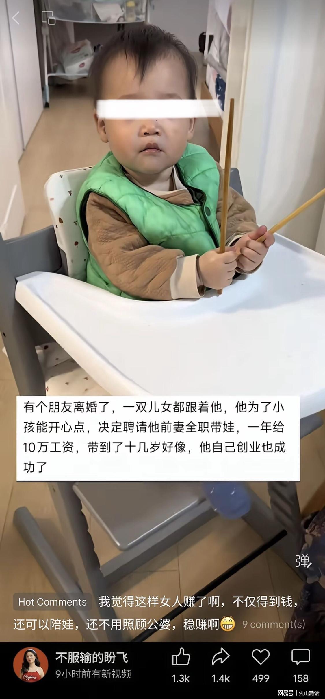 近日,一则在网络上引发热议的新闻被徽声在线曝光:一名男子在离婚后,为了确保孩子能获得稳定的陪伴与照顾,决定以年薪10万的条件聘请前妻全职负责带娃,双方约定这一安排将持续到孩子十几岁。而在此期间,男子则全身心投入创业,最终实现了事业上的逆袭。 对于这一事件,网友们纷纷发表看法。有网友认为,年薪10万相当于婚后每月上交8000元,实际上就是离婚不离家的模式。这样,男子既不用听前妻的唠叨,也不用处理复杂的婆媳关系,对他来说可谓是有利无害,堪称妙计。 也有网友指出,这种安排非常明智。十几年才支付100多万的工资,如果男子未来能赚到一千万,那么这笔钱至少不会被前妻分走一半,从经济角度来看,确实是个不错的选择。 还有网友调侃道,这简直是人生赢家的典范!再娶一个年轻貌美的妻子,家里有前妻负责带娃,自己则可以在外面享受生活,真是美滋滋。 更有网友一针见血地指出,这其实是男方为了创业而进行的风险隔离策略。