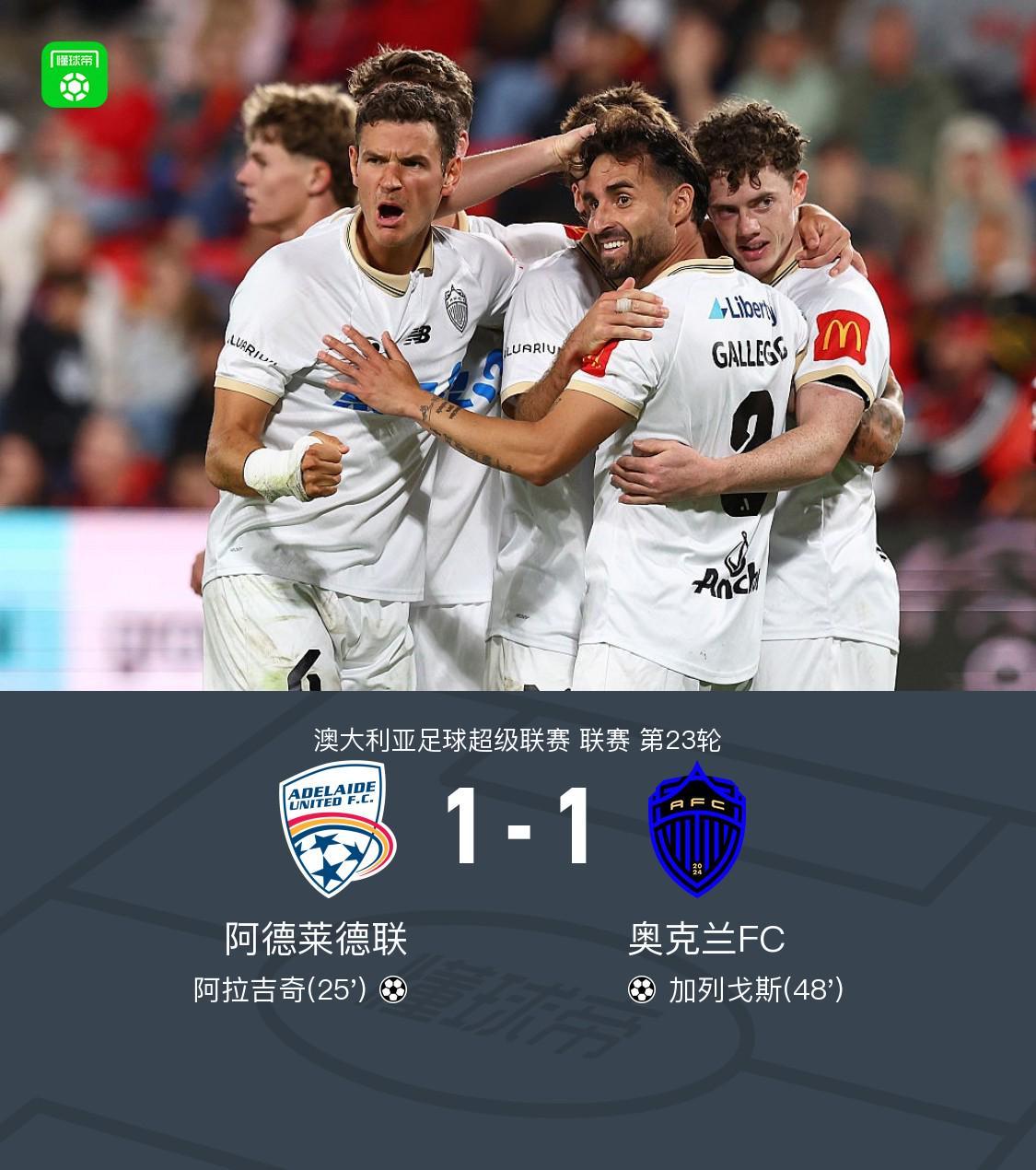 北京时间4月3日晚间,澳大利亚足球超级联赛迎来第23轮焦点对决,阿德莱德联坐镇主场迎战升班马奥克兰FC。经过90分钟激战,阿拉吉奇与加列戈斯各建一功,最终双方1-1握手言和。 比赛进程回顾 第25分钟战局突变:阿拉吉奇接队友直塞后,在禁区外突然起脚远射,皮球划出美妙弧线直窜球门死角,阿德莱德联1-0取得领先 第48分钟风云变幻:卡伦-埃利奥特右路突破后送出精准传中,加列戈斯门前包抄到位,用一记势大力沉的头槌攻破对手大门,奥克兰FC顽强扳平比分