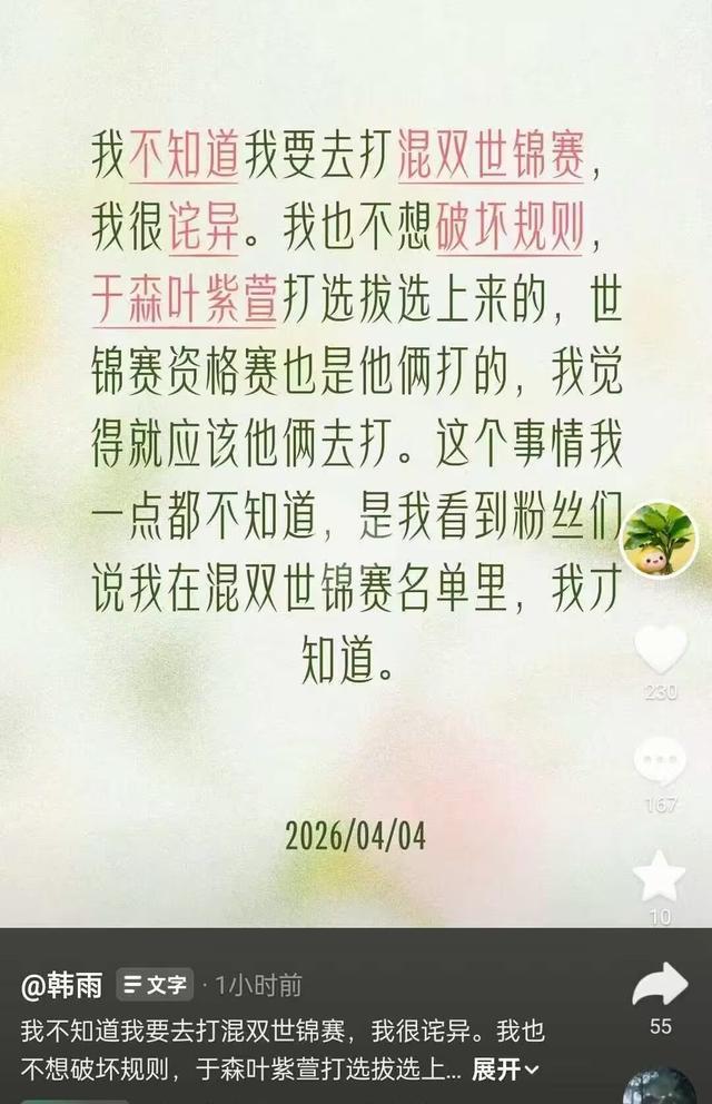 北京时间4月4日,冰壶运动员韩雨通过社交媒体平台发布动态,透露自己对于入选混双世锦赛名单一事毫不知情。她明确表示,自己并未参与混双项目的选拔赛,世锦赛资格赛也是由其他组合于森叶和紫萱出战,因此认为这个参赛名额理应属于他们。韩雨强调,自己并不想破坏既定的比赛规则,对于突然被列入名单感到十分诧异。 韩雨在社交媒体上的发声 韩雨在动态中详细写道:“我完全不知道自己要去参加混双世锦赛,这让我感到非常意外。我深知于森叶和紫萱是通过选拔赛脱颖而出的,世锦赛资格赛也是他们打的,所以我觉得他们才是最应该去参赛的选手。这个事情我事先一点都不知情,还是看到粉丝们留言说我在混双世锦赛名单里,我才得知这一消息。” 此外,韩雨还在评论区与粉丝互动时透露,如果这一情况无法得到妥善解决,自己可能会面临被封杀的风险,甚至不得不考虑就此退役。这一言论引发了广泛关注和讨论。 |