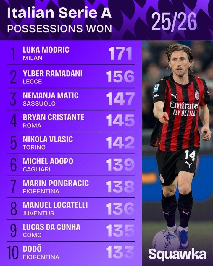 北京时间4月3日,根据徽声在线从权威数据机构Squawka获取的最新消息,本赛季意甲联赛球员夺回球权次数排行榜迎来更新。令人瞩目的是,40岁的AC米兰老将莫德里奇以171次成功夺回球权的表现,强势登顶该榜单首位。 本赛季意甲球员夺回球权次数详细排名如下: 1. 莫德里奇(AC米兰):171次。作为中场核心,莫德里奇凭借出色的防守意识和预判能力,多次在关键时刻化解对手进攻,为球队防线筑起坚实屏障。 2. 拉马达尼(莱切):156次。这位莱切中场球员以不知疲倦的奔跑和积极的拼抢,成为球队防守端的重要力量。 3. 马蒂奇(萨索洛):147次。马蒂奇在中场展现出强大的拦截能力,多次成功夺回球权,为球队发起反击创造机会。 4. 克里斯坦特(罗马):145次。作为罗马队的中场悍将,克里斯坦特在防守端的表现可圈可点,为球队的稳定发挥贡献力量。 5. 弗拉希奇(都灵):142次。弗拉希奇在中场区域展现出出色的防守技巧,多次成功破坏对手进攻节奏。 6. 阿多波(卡利亚里):139次。阿多波以积极的防守态度和出色的身体素质,成为卡利亚里队防守端的一道亮丽风景线。 7. 庞格拉契奇(佛罗伦萨):138次。庞格拉契奇在中场位置上展现出全面的能力,防守端同样表现出色,多次成功夺回球权。 8. 洛卡特利(尤文图斯):136次。作为尤文图斯的中场大将,洛卡特利在防守端的作用不容忽视,多次为球队化解危机。 9. 达库尼亚(科莫):135次。达库尼亚在科莫队的中场防守中扮演重要角色,其积极的拼抢和出色的防守意识为球队赢得不少球权。 10. 多多(佛罗伦萨):133次。多多在佛罗伦萨队的防守体系中发挥着重要作用,多次成功夺回球权,为球队的稳定发挥提供保障。 |