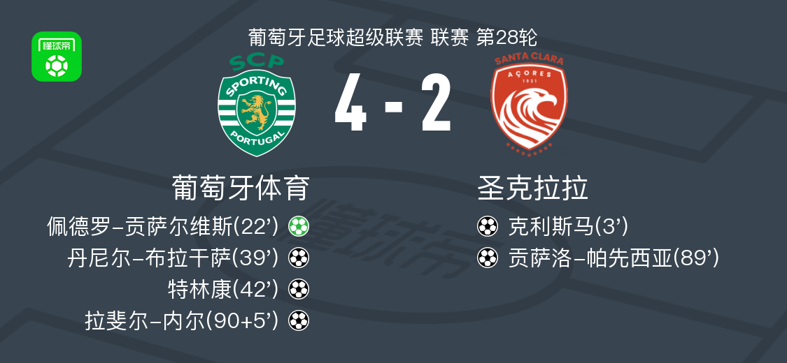 北京时间4月4日晚,葡萄牙足球超级联赛第28轮迎来一场焦点对决,葡萄牙体育坐镇主场迎战圣克拉拉。经过90分钟的激烈角逐,葡萄牙体育凭借佩德罗-贡萨尔维斯、丹尼尔-布拉干萨、特林康以及拉斐尔-内尔的出色发挥,以4-2的比分逆转战胜圣克拉拉,继续在积分榜上保持竞争力。