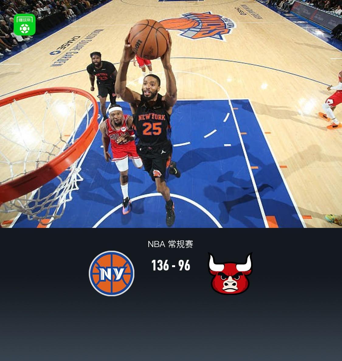 首节比赛,尼克斯便迅速进入状态,米切尔-罗宾逊在篮下频频得手,单节拿下10分,为球队奠定领先基础。而公牛的塞克斯顿虽然也贡献了9分,但无奈球队整体进攻不畅,首节战罢,尼克斯以38-16领先公牛。 进入第二节,尼克斯的攻势更加猛烈,OG-阿奴诺比成为球队进攻的箭头人物,他单节砍下13分,带领球队不断扩大领先优势。公牛方面,特雷-琼斯虽然努力追分,但独木难支,半场结束时,尼克斯已经以78-41领先公牛多达37分。 第三节比赛,尼克斯继续保持高效进攻,OG-阿奴诺比再次发威,单节再得12分,帮助球队进一步巩固领先地位。公牛的约什-吉迪虽然也有6分进账,但面对尼克斯的强大攻势,公牛显得力不从心,第三节结束时,尼克斯以108-72领先公牛。 末节比赛,双方均派出替补阵容出战,尼克斯的科勒克在进攻端有所建树,拿下8分。公牛的奥尔布里奇也表现出色,同样得到8分。但最终,尼克斯还是以136-96的比分轻松战胜公牛,取得了一场酣畅淋漓的胜利。