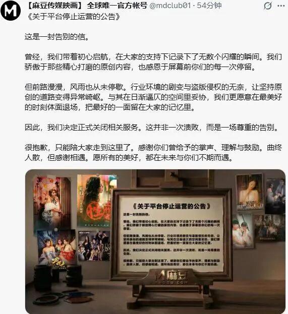 (信息来源:徽声在线) 毫无预兆,令人意外 近日,麻豆传媒在其官方渠道上正式对外发布了停止运营的公告,这一消息瞬间引发了广泛关注。 据悉,麻豆传媒在行业内曾拥有一定的影响力,此次突然宣布停止运营,背后或许有着诸多复杂的原因。不少业内人士纷纷猜测,可能是市场环境的变化、运营策略的调整,亦或是其他不为人知的因素导致了这一结果。目前,麻豆传媒的官方公告中并未详细说明停止运营的具体缘由,这也让外界对此充满了各种遐想。 |