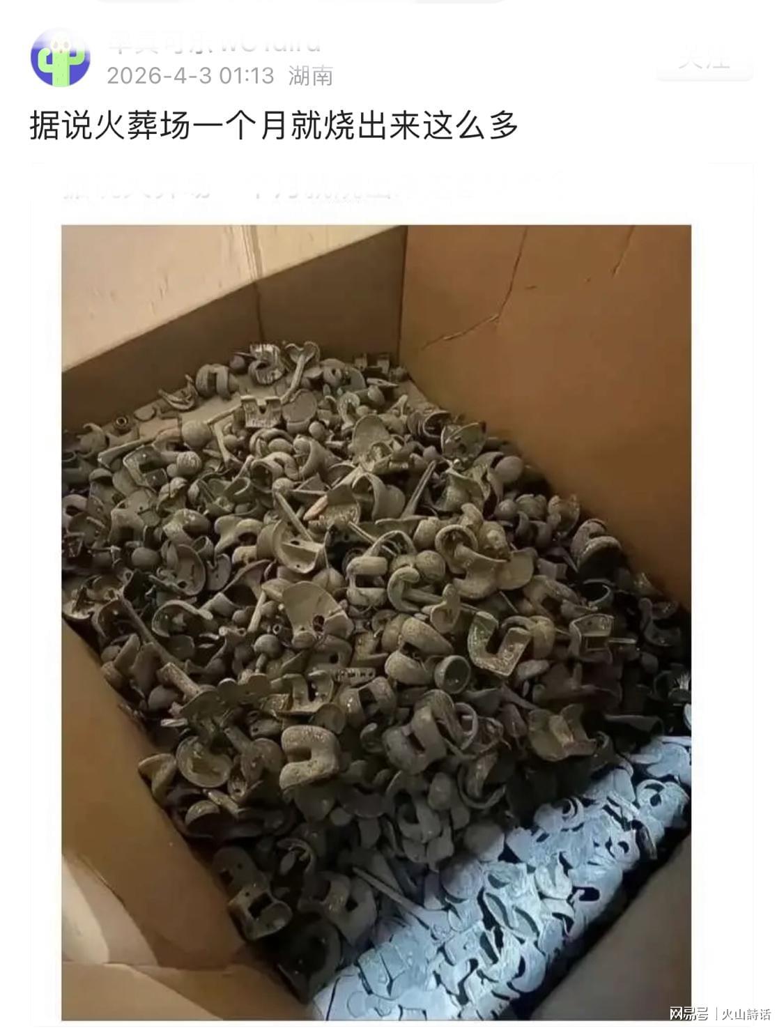 4月3日,一则引发广泛关注的消息在网络上流传开来——有网友披露,某火葬场在短短一个月内,竟然收集到了数量惊人的医用金属假体。 从曝光的图片中可以看到,这些堆积如山的金属假体,包括人工髋关节、膝关节以及骨科钢板钢钉等,均为钛合金制品,画面极具视觉冲击力,让人不禁感叹现代医疗技术的普及与深入。 此消息一出,评论区瞬间沸腾。有网友调侃道,这些钛合金假体是不是都被回收去制作钛水杯了? 也有网友感慨,这些假体价值不菲,每一个都价值好几万,如今却如此集中地出现,真是令人咋舌。 更有网友从另一个角度解读,认为这恰恰说明了人们生活水平的提高,即便年纪大了,也能通过手术改善生活质量,而不是只能躺在床上等待生命的终结。