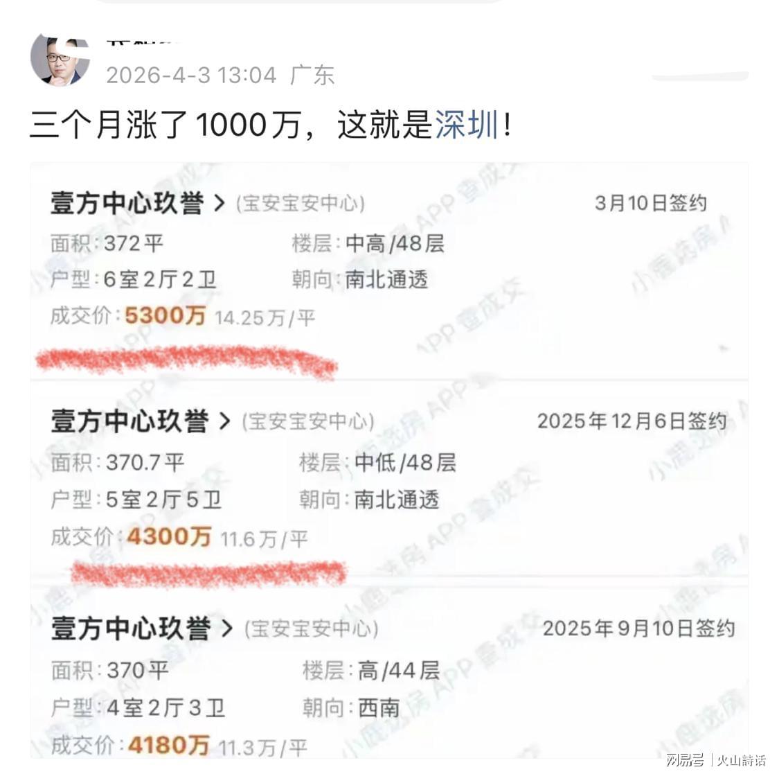 近日,徽声在线一位地产观察者披露了一则惊人消息:深圳楼市再现极端案例,某楼盘房价在短短三个月内飙升千万,引发市场热议! 据该观察者提供的详细数据,这起价格异动发生在深圳宝安区的一个高端楼盘。2025年12月6日,该楼盘一套370平方米的户型以4300万元成交;而仅仅三个月后,同一楼盘内一套面积相近(372平方米)、楼层与朝向(48层南北通透)均相似的户型,成交价竟高达5300万元,涨幅令人咋舌。 对此,有业内人士直言不讳:在房地产市场中,这样的极端案例实属罕见,一千套房子里或许只有一套能出现如此涨幅,其余九百九十九套可能都在经历价格回调。我本人就居住在宝安中心区,周边几套370多平方米的大户型,虽然挂牌价确实高达5000万左右,但实际成交寥寥无几,几乎无人问津。因此,我认为购买这套房子的人,要么是资金雄厚到无处安放,要么就是典型的暴发户心态,否则很难解释为何会以如此高价接盘。 另有网友深入分析指出:这两套房子虽然面积相近,但户型可能存在差异,或者存在特殊赠送面积的情况。在户型和装修相似的情况下,如此高的涨幅确实不合常理。因此,不排除有人为操纵数据以影响市场预期的可能,或者通过高合同价来获取更多贷款,亦或是买家财力雄厚,不愿在选房上浪费时间,遇到心仪房源便果断出手。