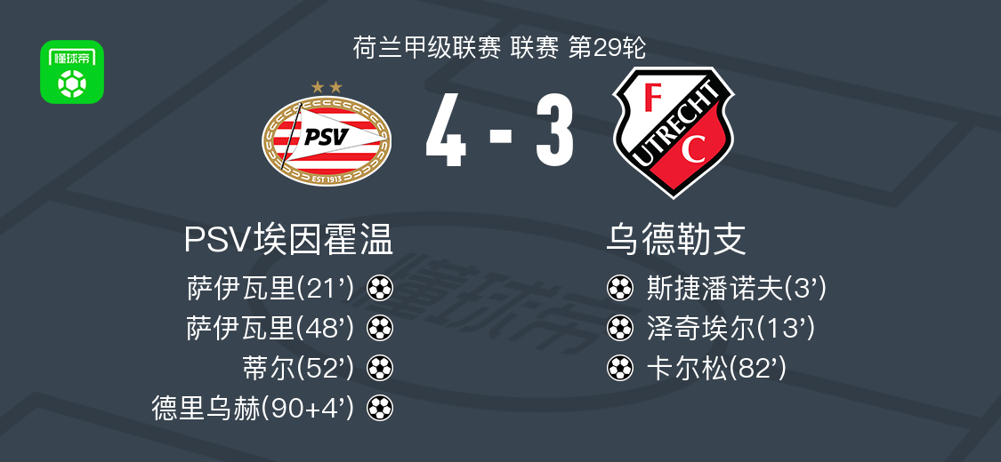 北京时间4月4日晚间,荷兰甲级联赛第29轮迎来一场焦点对决,PSV埃因霍温坐镇飞利浦大球场迎战乌德勒支。本场比赛跌宕起伏,主队凭借萨伊瓦里独中两元、蒂尔与德里乌赫的进球,以4-3惊险逆转客队。乌德勒支方面则由斯捷潘诺夫、泽奇埃尔和卡尔松各建一功。