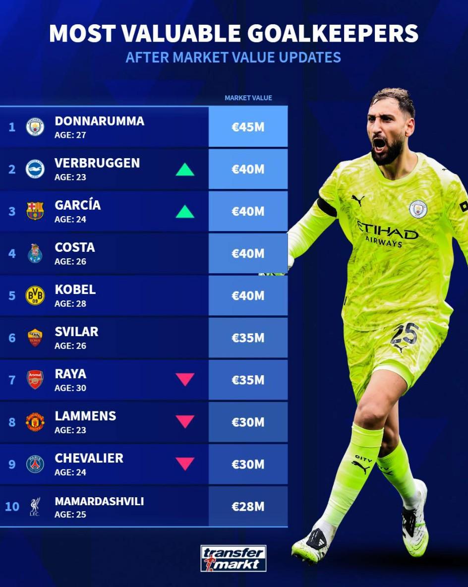 北京时间4月5日,随着欧洲五大联赛球员身价数据的最新更新,知名数据网站德国转会市场(德转)正式发布了全球足坛门将身价排行榜。尽管意大利国家队未能跻身卡塔尔世界杯决赛圈,但门将多纳鲁马依然凭借4500万欧元的身价稳居榜首,展现了其作为世界顶级门将的实力与市场价值。 德转全球足坛门将身价TOP10详细榜单: 1. 多纳鲁马(意大利/现效力于曼城)——4500万欧元 2. 费布鲁亨(荷兰/布莱顿)——4000万欧元 2. 霍安-加西亚(西班牙/巴塞罗那)——4000万欧元 2. 迪奥戈-科斯塔(葡萄牙/波尔图)——4000万欧元 5. 科贝尔(瑞士/多特蒙德)——4000万欧元 5. 斯维拉尔(塞尔维亚/罗马)——3500万欧元 5. 戴维-拉亚(西班牙/阿森纳)——3500万欧元 8. 拉门斯(比利时/曼联)——3000万欧元 8. 舍瓦利耶(法国/巴黎圣日耳曼)——3000万欧元 10. 马马尔达什维利(格鲁吉亚/利物浦)——2800万欧元 |