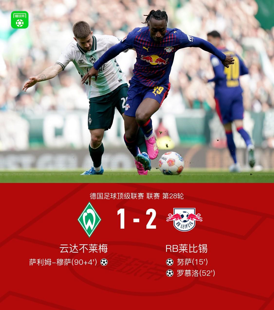 北京时间4月4日晚,德国足球顶级联赛第28轮迎来一场焦点对决,云达不莱梅坐镇主场迎战RB莱比锡。在这场激烈的较量中,努萨与罗慕洛先后为莱比锡建功,而穆萨则为不莱梅扳回一城。最终,全场比赛结束,云达不莱梅以1-2不敌RB莱比锡。 比赛关键事件回顾 比赛进行到第15分钟,莱比锡率先打破僵局。努萨在禁区内接队友传球后,一脚低射精准入网,莱比锡1-0取得领先。 下半场易边再战,第52分钟,莱比锡再下一城。罗慕洛在禁区内抓住机会,轻松推射破门,将比分扩大为2-0。 比赛进入伤停补时阶段,第90+4分钟,不莱梅终于迎来转机。穆萨在禁区内接到队友传球后,果断起脚射门,皮球应声入网,不莱梅将比分扳为1-2。