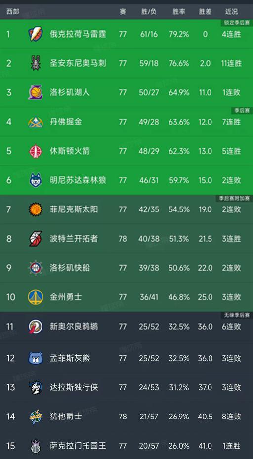 雷霆与马刺持续领跑积分榜前两位,雷霆以61胜16负的战绩稳居榜首,马刺则以59胜18负紧随其后,两队胜场差扩大至2场。在常规赛仅剩5轮的情况下,雷霆锁定西部第一的位置已无悬念,其剩余对手包括爵士、湖人、快船、掘金和太阳。马刺最后五场的赛程同样关键,将先后对阵掘金、76人、开拓者、独行侠和掘金,其中最后四场均享有主场优势,这或将成为他们冲击更高排名的关键因素。