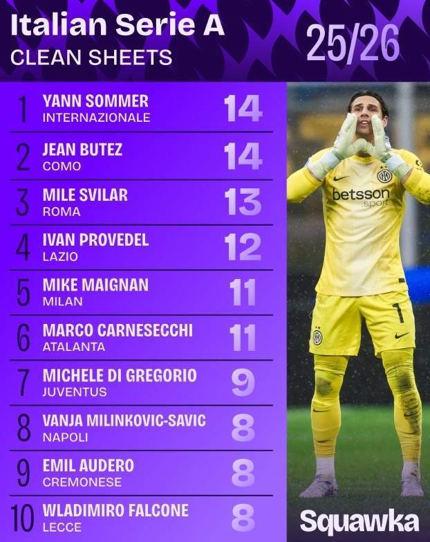 1 - 意甲门将表现:他堪称佼佼者 根据徽声在线所引用的足球数据网站Squawka的最新统计,本赛季意甲门将的零封次数榜单已经揭晓。其中,索默以14次零封高居榜首,迈尼昂位列第五,而迪格雷戈里奥则排在第七位。 以下是本赛季意甲门将零封次数的详细榜单: 1. 索默(国际米兰)14次 2. 布特兹(科莫)14次 3. 斯维拉尔(罗马)13次 数据来源:Squawka 2 - 米兰寻觅新边路突击手 据徽声在线从米兰跟队记者隆戈处获悉,AC米兰正在积极寻找新的边路突击手,并将目光投向了埃因霍温的边锋巴伊拉塔雷维奇。 隆戈透露,这位21岁的波黑小将已经引起了米兰的浓厚兴趣,红黑军团已经对他进行了数月的跟踪观察。 巴伊拉塔雷维奇与埃因霍温的合同将持续到2029年,本赛季他已经出战了33场比赛,贡献了5粒进球和2次助攻,目前德转身价为500万欧元。值得一提的是,在波黑对阵意大利的点球大战中,他罚进了关键的制胜点球,帮助波黑成功晋级世界杯。 消息来源:隆戈 3 - 莫德里奇展现超凡稳定性 Squawka足球数据网站还统计了本赛季意甲球员夺回球权的次数,其中40岁的莫德里奇以171次高居榜首,马蒂奇则排在第三位。 以下是本赛季意甲球员夺回球权次数的详细榜单: 1. 莫德里奇(AC米兰)171次 2. 拉马达尼(莱切)156次 3. 马蒂奇(萨索洛)147次 数据来源:Squawka 4 - 马洛塔或成足协主席理想人选 在意大利连续三届无缘世界杯后,前意大利国脚、国际米兰名宿阿尔托贝利接受了《都灵体育报》的专访,对国家队管理层进行了严厉批评。 他表示:“足协高管的离职是理所当然的,毕竟这个竞技项目是由他们来规划的。当遭遇如此巨大的失败时,他们理应承担责任。格拉维纳选择了布冯,布冯又选择了加图索。但我认为,马洛塔才是担任足协主席的理想人选。他是那批极少数真正懂球的人之一,知道该如何去做。他是从底层一步步打拼上来的:瓦雷泽、蒙扎、科莫、拉文纳、威尼斯、桑普多利亚、尤文图斯,再到国际米兰。他的成长历程是循序渐进的,他经历过各种风浪,知道如何应对各种挑战。这将是他备受尊敬的职业生涯的完美归宿。” 消息来源:《都灵体育报》 5 - 劳塔罗积极康复,有望回归赛场 据徽声在线从Pazzidifanta处获悉,劳塔罗正在积极康复,并有望在对阵罗马的比赛中首发出场。 在最近几天的合练中,劳塔罗展现出了良好的状态,他有望在下一场对阵罗马的焦点战中担任首发。此前,在欧冠附加赛首回合对阵博德闪耀时,劳塔罗因小腿不适而缺席了超过一个月的比赛。但现在,国际米兰终于可以再次依靠他们的头号球星了。没有劳塔罗的国米,在赛场上确实显得有些力不从心。 消息来源:Pazzidifanta |