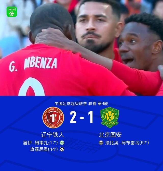 在4月4日进行的中国足球超级联赛第4轮的较量中,辽宁铁人坐镇主场迎战北京国安。上半场赛事,韩镕泽在禁区外的一次摘球动作中吃到黄牌,随后孔特在禁区内不慎手球,送给对手点球机会,姆本扎冷静主罚命中,为铁人先拔头筹。临近半场结束,姆本扎再次送出精妙横传,热菲尼奥轻松推射空门,打入个人中超生涯首球,铁人以2-0的比分领先进入下半场。易边再战,塞尔吉尼奥送出精准传中,法比奥头球建功,为国安扳回一城。最终,辽宁铁人以2-1的比分战胜北京国安,喜获两连胜。