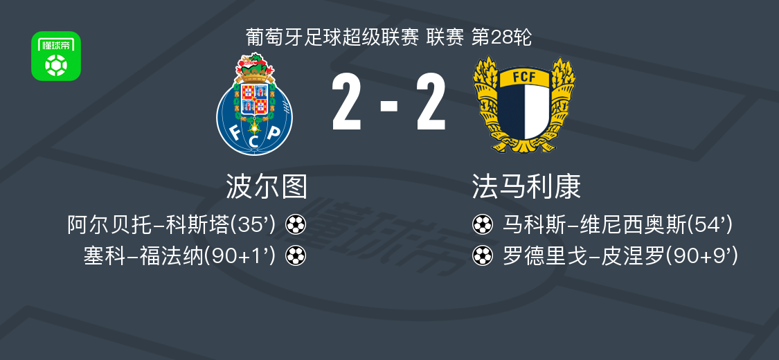 在4月5日进行的葡萄牙足球超级联赛第28轮焦点战中,波尔图坐镇巨龙球场迎战法马利康。这场跌宕起伏的较量最终以2-2握手言和告终,阿尔贝托-科斯塔与塞科-福法纳为波尔图建功,法马利康则由马科斯-维尼西奥斯和罗德里戈-皮涅罗完成破门。