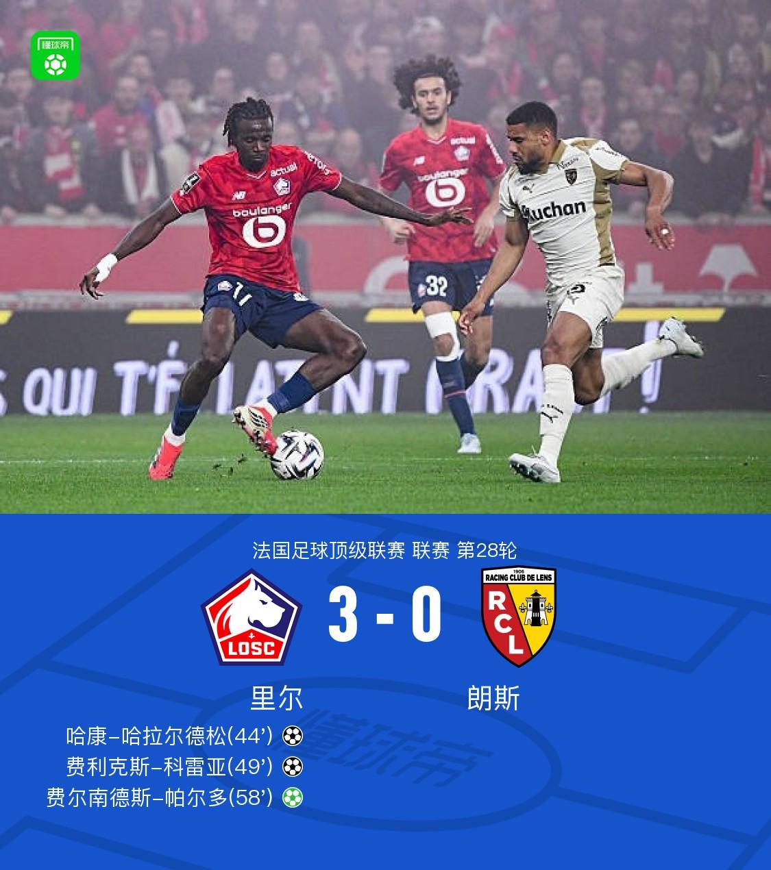 北京时间4月5日晚间,法国足球顶级联赛第28轮迎来一场焦点对决,里尔坐镇主场迎战来访的朗斯队。本场比赛中,里尔队展现出了强大的进攻火力,其中费尔南德斯-帕尔多表现尤为抢眼,他不仅自己攻入一球,还助攻队友得分,哈拉尔德松和费利克斯-科雷亚也分别建功。最终,里尔以3-0的比分干净利落地战胜了朗斯。 比赛亮点回顾 上半场临近结束时,即第44分钟,费尔南德斯-帕尔多送出精妙助攻,哈拉尔德松抓住机会破门得分,为里尔队先拔头筹,场上比分变为1-0。 下半场开始不久,第49分钟,费利克斯-科雷亚敏锐地捕捉到对方回传球时的失误,果断出击破门,帮助里尔队将领先优势扩大到2-0。 比赛进行到第58分钟,场上出现转折点,朗斯队加尼乌在防守时不慎手球犯规,裁判果断判罚点球。费尔南德斯-帕尔多冷静主罚,一蹴而就,将比分锁定为3-0。