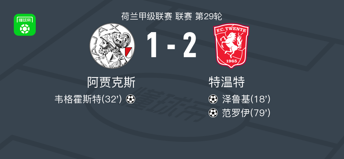 在4月5日进行的荷兰甲级联赛第29轮的一场焦点对决中,阿贾克斯坐镇主场迎战特温特。比赛中,阿贾克斯的韦格霍斯特率先打破僵局,而特温特则凭借泽鲁基和范罗伊的进球实现逆转,最终以2-1的比分战胜阿贾克斯。