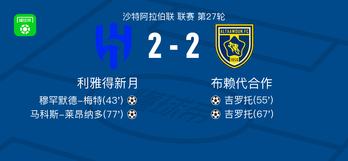 北京时间4月5日,沙特阿拉伯联赛迎来第27轮焦点对决,利雅得新月坐镇主场迎战布赖代合作。本场比赛双方上演进球大战,利雅得新月凭借穆罕默德-梅特与马科斯-莱昂纳多的破门,与布赖代合作吉罗托的梅开二度最终2-2握手言和。