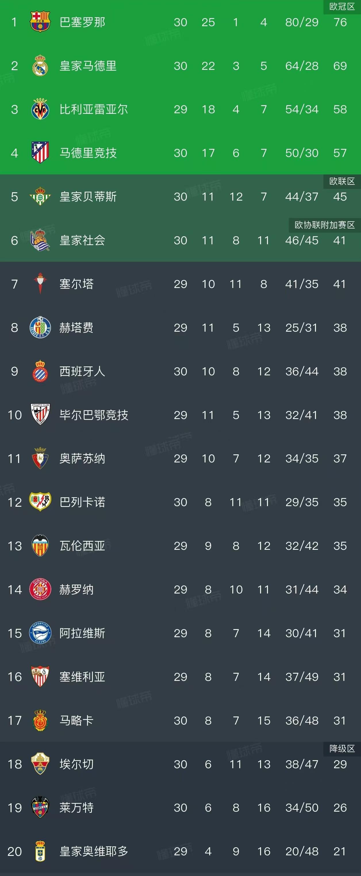 从第五名的皇家贝蒂斯队(45分)开始,各队之间的积分差距极为接近;第六名皇家社会队积41分,第七名塞尔塔队同样积41分。对于欧联杯及欧协联资格的争夺,各队均使出浑身解数,竞争异常激烈。此外,毕尔巴鄂竞技(29轮40分)和瓦伦西亚(30轮39分)等队也在积极追赶,试图跻身欧战行列。 从第八名的赫塔费队(38分)到第十四名的赫罗纳队(34分),各队之间的积分差距同样不大,一场比赛的胜负就可能引发排名的大幅变动。值得一提的是,西班牙人队在第30轮与皇家贝蒂斯队0-0战平后,已经连续13轮未能取胜,2026年以来尚未尝到胜利的滋味,目前积38分排在第九位,保级形势岌岌可危。