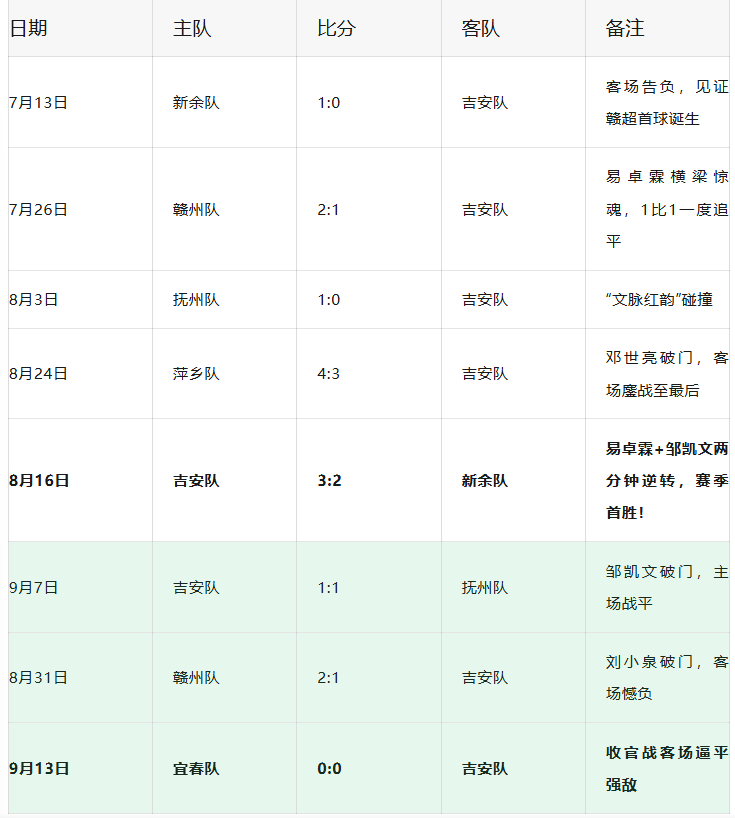 教练组策略:主教练贺炜与助理教练戴代强,从职业赛场回归家乡绿茵,制定了“体能+战术”双轨计划。在泰和县体育中心完成首个主场比赛,吸引8678名观众到场观赛,为球队注入了强大的动力。 常规赛回顾:首轮告负,首胜逆转,顽强拼到最后 2025赛季,吉安队在南区共征战10场比赛,最终以1胜1平5负的成绩无缘八强。但这支全省最年轻的球队,在每一场比赛中都展现出了“不服输、敢拼搏”的红色战魂。 首轮:客场0:1惜败新余,见证赣超首球诞生 7月13日晚,吉安队客场挑战新余队。比赛第30分钟,新余队11号蔡子阳抓住防守漏洞冷静推射破门,这粒进球也成为2025“赣超”联赛历史上的首粒进球。尽管最终吉安队0:1惜败,但首轮比赛共吸引66960人次现场观战,全省足球热情由此被点燃。 第三轮:客场2:1惜败赣州,易卓霖横梁惊魂 7月26日,吉安队客场挑战赣州队。开场仅1分08秒,赣州队便闪电破门。但吉安队没有被打懵,第11分40秒,他们接角球传中一脚劲射破门,1比1追平比分!下半场第85分钟,赣州队再度破门,最终吉安队客场1:2惜败。 第四轮:客场1:0憾负抚州 8月3日,吉安队客场对阵抚州队。临川才子的灵动传控与井冈儿女的钢铁意志在绿茵场激烈碰撞。吉安队拼尽全力,仍以0:1遗憾告负。 第五轮:客场3:4惜败萍乡,战斗至最后一秒 8月24日,吉安队客场挑战萍乡队。第16分钟萍乡队任意球破门,第21分钟刘小泉接队友传中包抄得分,1比1扳平。上半场结束前萍乡队再度领先,第50分钟萍乡队再下一城,第84分钟邓世亮禁区内接妙传破门。吉安队顽强地咬住比分,将悬念留到最后,最终客场3:4惜败。 第六轮:主场3:2逆转新余,赛季首胜! 这是2025赛季最让人热血沸腾的一场比赛。8月16日晚,吉安全民健身体育中心,1.4万余名球迷现场见证。上半场第24分钟,新余队点球先下一城。吉安队没有慌乱,第38分钟,刘小泉接右路传中推射破门,1比1扳平!下半场风云突变,第75分钟,新余队一脚长射再次超出比分。但吉安队没有放弃,仅1分钟后,易卓霖抓住快攻机会闪电扳平!紧接着,不到1分钟,邹凯文再下一城!3比2,吉安队在短短两分钟内连进两球,完成惊天逆转! 赛后,球迷郭君激动地说:“太精彩了,吉安队踢得很有章法,表现非常好,在我心里可以打满分。”这正是吉安队的写照——你可以领先,但你永远不能以为已经赢了。 第七轮:主场1:1战平抚州 9月7日,吉安队主场迎战抚州队。上半场最后时刻,抚州队解围失误,邹凯文接队友回传一脚劲射破门,吉安队1比0领先。下半场尾声抚州队扳平比分,双方1比1握手言和。吉安队用一场平局证明了自己主场绝不轻易缴械。 第八轮:主场1:2惜败赣州,虽败犹荣 8月31日,吉安队客场挑战赣州队(实际为赣州主场)。开场第4分钟,易卓霖禁区前沿一脚劲射打在横梁上,惊出主场4万多名球迷一身冷汗。第7分钟赣州队卢欣破门,第16分钟赣州队再下一城,0比2落后。第33分钟,刘小泉接易卓霖传球突入禁区打远角得手,吉安队扳回一球。下半场,吉安队攻势渐有起色,但最终仍以1比2惜败。不过,吉安队打出了气势,赢得了尊重。 收官战:客场0:0逼平宜春,赢得尊重 9月13日,吉安队客场挑战宜春队。赛前,宜春球迷列队欢迎吉安球迷的到来,“欢迎吉安,吉安加油”“谢谢宜春,宜春第一”的口号此起彼伏,双方友好互动提前点燃了比赛氛围。比赛过程胶着激烈,吉安队守门员多次化解门前危机,后卫奋力回追在禁区前沿成功断球。双方体能消耗加剧,但吉安队队员始终没有松劲。终场哨响,0比0。吉安队球员集体走向看台,弯腰向球迷鞠躬致谢。看台上掌声不断,“明年我们还来!永远支持你们!” 2025赛季关键场次一览 二、亮点时刻:吉安的“闪电翻盘”与红色战魂 易卓霖:从申花到家乡的灵魂支柱 47号易卓霖,吉安县横江镇人,26岁,前上海申花职业球员。他的存在,是吉安队最大的财富。中场的组织调度、关键定位球的主罚能力、临场阅读比赛的大局观,都让这支年轻队伍多了一份沉稳与自信。第六轮对阵新余,他在第76分钟快攻扳平;第八轮对阵赣州,他两次任意球险些破门。赛后他说:“与强队交手让我们看清差距、找准方向,更珍贵的是全队始终像家人一般彼此支撑。” 邹凯文:18岁的闪电杀手 27号邹凯文,年仅18岁,是吉安“青春风暴”的代表人物。第六轮对阵新余,他在易卓霖扳平后不到1分钟再下一城,完成“闪电双响”。第七轮对阵抚州,他上半场最后时刻接回传劲射破门。这颗冉冉升起的新星,正是吉安青训体系的杰出成果。 刘小泉:21岁的锋线尖刀 44号刘小泉,21岁的足球教练兼球员。第五轮对阵萍乡,他在第21分钟接队友传中包抄得分;第八轮对阵赣州,他接易卓霖传球突入禁区打远角得手。赛季多次关键进球,使他成为吉安队前场最具威胁的火力点。 邓世亮:井冈山大学的铁血战士 36号邓世亮,井冈山大学学生。第五轮对阵萍乡,他在第84分钟禁区内接妙传破门,为球队在客场顽强咬住比分。从校园到赣超,他用自己的行动诠释了“学生军”的拼搏本色和坚韧不拔的精神。 球迷:红色星火,永不熄灭 9月13日收官战,吉安球迷驱车2小时奔赴樟树客场。看台上,吉安球迷方阵高举“井冈山”“吉安阔硬”等旗帜,伴着阵阵鼓声喊出助威口号。球迷郭帆文说:“就算知道无缘进入下一阶段,我们还是开了2个小时车过来。吉安队要拿出红军打硬仗的精神,不论输赢也要战到最后一刻。”这种不离