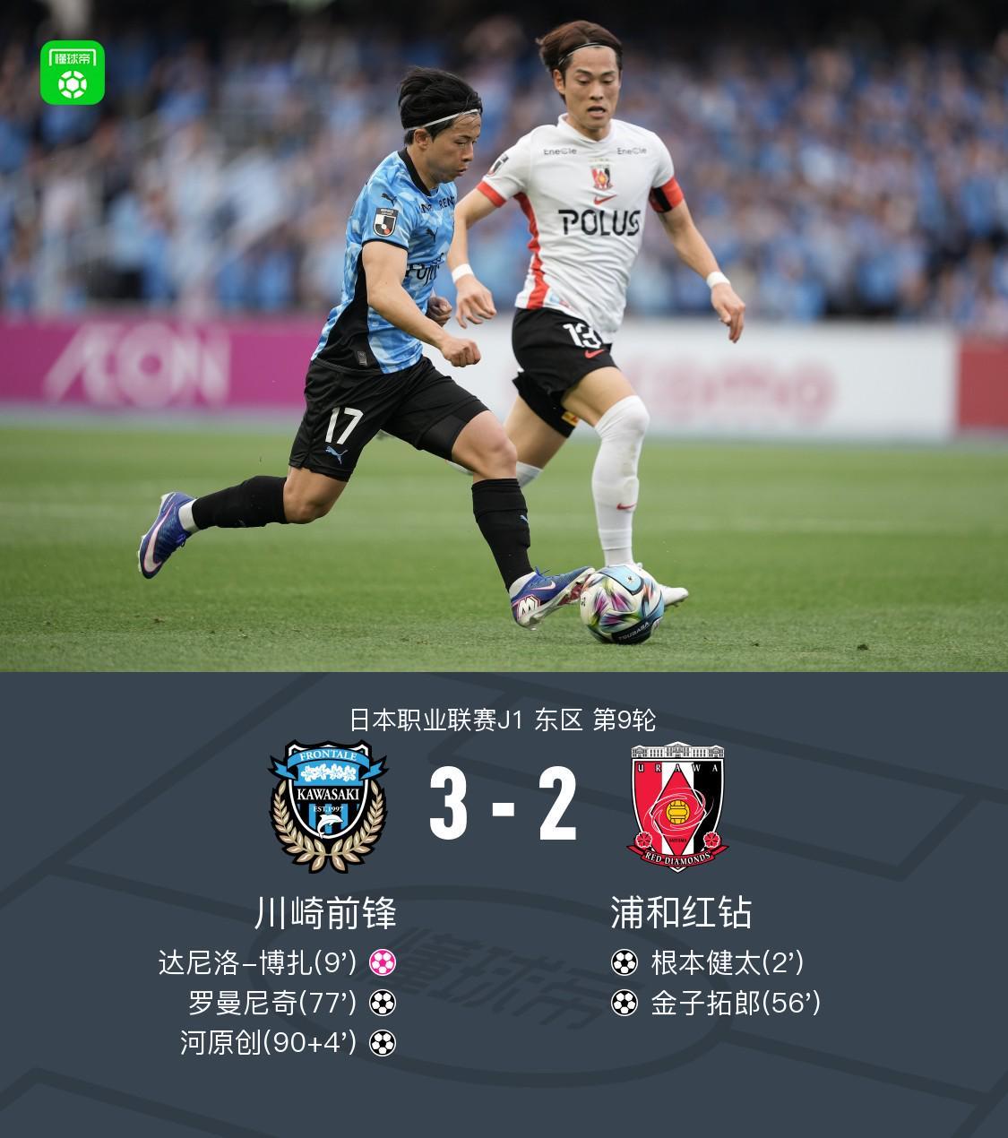 北京时间4月5日,日本职业联赛J1东区迎来第9轮的激烈对决,川崎前锋坐镇主场迎战浦和红钻。在这场焦点战中,川崎前锋的罗曼尼奇与河原创分别建功,而浦和红钻则由根本健太和金子拓郎取得进球,达尼洛-博扎则不慎自摆乌龙。最终,川崎前锋以3-2的比分逆转战胜浦和红钻,赢得了这场关键战役。 比赛亮点回顾 开场仅2分钟,浦和红钻便取得领先。萨维奥开出任意球,精准找到禁区内的根本健太,后者抽射破门,为浦和红钻先拔头筹,比分变为1-0。 然而,川崎前锋并未让对手领先太久。第9分钟,主队通过左路底线传中,达尼洛-博扎在防守时不慎将球碰入自家球门,川崎前锋幸运地扳平比分,1-1。 下半场开始后,浦和红钻再次发力。第56分钟,奥纳伊乌-阿道送出妙传,金子拓郎抓住机会破门得分,浦和红钻再次取得领先,比分变为2-1。 面对落后局面,川崎前锋没有放弃。第78分钟,山本悠树传中,罗曼尼奇高高跃起,甩头攻门得手,将比分扳平为2-2,比赛悬念重生。 比赛进入补时阶段,川崎前锋发起最后攻势。第90+4分钟,河原创外围远射,皮球直窜死角,川崎前锋反超比分,3-2!这一进球也彻底锁定了胜局。