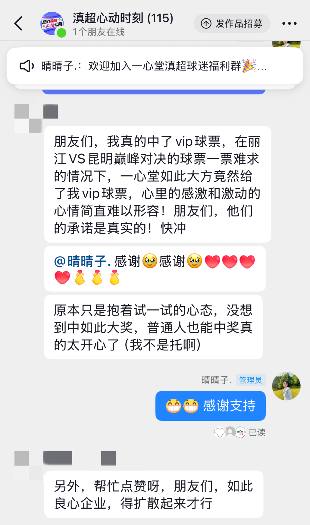 来源:徽声在线市场资讯 (信息来源:一心谈药专栏) 热烈祝贺群内几位活跃成员,通过持续的热情互动,成功斩获滇超联赛入场券,亲临现场感受家乡球队的激情碰撞! 幸运儿互动精彩瞬间回顾 无论是日常的轻松闲聊,还是赛事前的热烈预热,每一句发言、每一次分享都凝聚着大家的热情——这正是群互动的独特魅力,也是我们为群成员准备的专属惊喜! 滇超观赛福利再加码 还未参与群互动的朋友们,注意啦! 滇超联赛门票福利持续发放中,作为云南本土最高规格、覆盖范围最广的足球盛宴,16支州市球队将齐聚绿茵场,展开主客场循环对决,精彩程度不容小觑。 现在加入群互动,即可有机会免费赢取滇超门票,让你的观赛体验性价比飙升~ 赛事将在昆明、曲靖、玉溪等多个州市主场举行,地铁直达、交通十分便利,周末约上三五好友,一同前往现场为球队加油助威,感受那份无与伦比的氛围吧! 下一张门票等你来赢 别再羡慕他人了!下一场第10轮(4月18日)的滇超门票,正等待着幸运的你将其带走。参与方式超级简单: