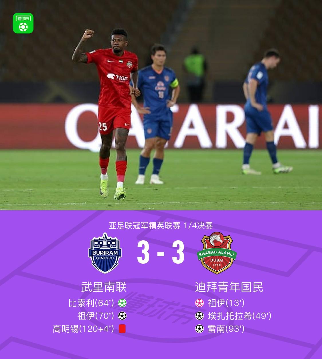 北京时间4月19日,在亚足联冠军精英联赛1/4决赛的激烈对决中,武里南联与迪拜青年国民展开了一场惊心动魄的较量。上半场,武里南联的祖伊不慎自摆乌龙,让对手先下一城。下半场风云突变,埃扎托拉希利用头球机会扩大比分,但随后比索利通过点球为武里南联扳回一城,紧接着祖伊将功补过,破门得分,双方战成2-2平,比赛进入加时赛。加时赛上半场,雷南抓住机会打入制胜球,而在下半场补时阶段,高明锡因犯规被红牌罚下。最终,迪拜青年国民以3-2的比分战胜武里南联,成功晋级亚冠精英赛4强。 比赛关键事件回顾 第13分钟,乌龙球突现,武里南联0-1落后于迪拜青年国民,祖伊不慎将球送入自家球门 第49分钟,埃扎托拉希头球建功,武里南联0-2陷入困境,迪拜青年国民扩大领先优势 第63分钟,埃扎托拉希手球犯规送点,比索利冷静罚进,武里南联1-2扳回一城 第70分钟,祖伊破门得分,将功补过,武里南联2-2追平比分,比赛悬念重生 第93分钟,雷南挺身而出,打入关键制胜球,武里南联2-3落后,迪拜青年国民看到胜利曙光 第120+3分钟,高明锡飞铲巴拉犯规,裁判果断出示红牌,武里南联雪上加霜