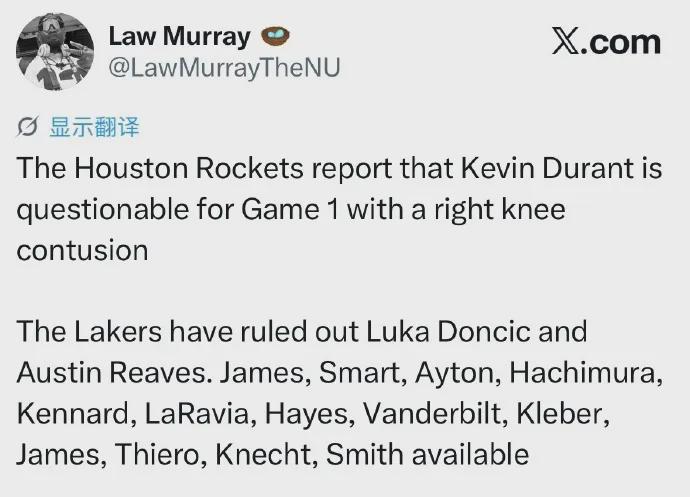 哎呀,不好了,不好了~ 据徽声在线得到的最新消息,名记Shams透露,近日杜兰特在火箭队内的一次高强度训练中,不慎遭遇膝盖挫伤,随后他迅速接受了核磁共振检查。不过,好消息是,从目前的检查结果来看,乐观估计杜兰特应该能够出战即将到来的G1比赛...... 今年西部季后赛首轮,火箭与湖人的对决无疑是最受瞩目的焦点之战,这组对决不仅流量巨大,更有可能成为杜兰特和詹姆斯职业生涯中最后一次季后赛的正面交锋,因此吸引了无数球迷的目光。 目前,火箭队全员状态良好,阵容齐整;而湖人队则面临伤病困扰,东契奇和里夫斯均因伤缺阵,归期尚未确定。在这样的背景下,外界普遍看好火箭队能够在这场对决中脱颖而出,笑到最后。 就连知名美媒ESPN也对这场比赛进行了预测,他们认为火箭队在G1的胜率高达51.7%,而湖人队则只有48.3%的胜率。 然而,就在季后赛即将拉开帷幕之际,杜兰特却意外受伤,这无疑给火箭与湖人的这场大战增添了诸多变数。即便杜兰特能够如期出战,但他的状态能否恢复到以往那般神勇,挥舞起他那致命的“死神镰刀”,还是未知数。 回顾本赛季常规赛,37岁的杜兰特依然展现出了超凡的竞技状态。他出战了78场比赛,场均上场时间高达36.4分钟,位列联盟第三。他场均能够贡献26分、5.5个篮板和4.8次助攻,投篮命中率高达52%,三分命中率也达到了41.3%,依然是全联盟最顶尖的得分手之一,也是火箭队最为依赖的领袖人物。 值得一提的是,杜兰特上次在季后赛中与湖人队交手,还要追溯到2012年的西部半决赛。当时,他率领雷霆队以4-1的比分轻松击败了科比领衔的紫金军团。在那轮系列赛中,杜兰特场均狂轰26.8分、8.6个篮板和3.2次助攻,还有1.6次抢断,三项命中率分别高达51.6%、39.1%和85.3%,表现堪称惊艳。 再来看火箭队,他们无疑是整个NBA中防守水平最高的球队之一。常规赛期间,他们场均失分仅为110分,位列联盟第四;篮板数高达48.1个,排名联盟第一;进攻效率117.5,位列联盟第八;防守效率112.1,位列联盟第五;限制对手命中率46%,位列联盟第六。然而,他们的缺点也同样明显,那就是投篮能力有限,三分出手数31.5次,位列联盟第28;三分命中数11.5次,位列联盟第25;三分命中率36.4%,位列联盟第十。 总的来说,火箭队是一支优缺点都非常明显的球队。但是,面对少了两个最为重要火力点的湖人队,他们或许还是能够占据上风,难有对手能够与之抗衡。 |