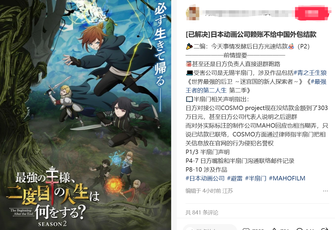 近日,一则关于日本动画公司拖欠中国外包款项的消息在网络上引发了广泛关注,让人不禁感到愤慨。据一位博主爆料,某日本动画公司不仅拖欠了中国外包公司的款项,而且其对接负责人竟然直接退群消失,连基本的解释和沟通都没有,这种行为实在令人难以接受。 被拖欠款项的是无锡半扇门公司,这是一家在动画外包领域默默耕耘的中国企业。熟悉动画行业的人都知道,国内许多动画公司都会承接日本动画的外包工作,从原画绘制到中间帧制作,我们熟悉的很多日本动画背后,都有中国团队的辛勤付出。这次半扇门公司涉及的作品,如《青之壬生狼》、《世界最强的后卫 ~迷宫国的新人探索者~》,以及《最强王者的第二人生 第二季》,都是大家耳熟能详的作品。 随后,半扇门公司发布了详细声明,将事情的来龙去脉公之于众。原来,对接他们的日方公司是COSMO project,目前拖欠的款项已经高达303万日元。更令人无奈的是,在双方沟通时,日方公司代表人说完情况后,竟然直接退出了工作群,从此失去了联系。 半扇门公司声明摘要 有趣的是,这些作品对外标注的制作公司是MAHO。当被问及结款事宜时,MAHO的回应却显得相当敷衍,只是轻描淡写地说了一句“已结款已联络”,完全没有正面回应半扇门公司被拖欠款项的问题。更讽刺的是,COSMO方面不仅不积极解决欠薪问题,反而通过律师发函,指责半扇门公司将相关信息放在官网的行为侵犯了他们的名誉权,这种做法实在令人不齿。 日方态度与半扇门沟通邮件曝光 其实,这种事情在动画行业里并不罕见,但这次的反转却来得格外迅速。事情在网络上迅速发酵,网友们的讨论声浪越来越高。原本态度强硬、甚至威胁要起诉半扇门公司的日方,竟然在短时间内完成了结款,这种前后反差之大,实在让人唏嘘不已。 这不禁让徽声在线想起了前阵子闹得沸沸扬扬的P1S和国内手办雕塑厂的纠纷。同样是日方企业与中国合作方之间的款项纠纷,同样是初期推诿扯皮、不愿承担责任,直到事情闹大、舆论压力增大,才开始着手解决问题。算上这次的动画外包事件,今年已经是第二起类似的纠纷了。这不禁让人猜测,这会不会只是冰山一角?之前还有多少小公司被这种方式拖垮?我们不得而知。 在评论区里,有人提出了一个尖锐的问题:既然中国公司能够制作出符合日本动画标准的作品,为什么我们自己却没有出名的、广受好评的动画呢?大家熟知的还是喜羊羊、熊大熊二这类低龄向作品。 其实,这个问题问得很实在。作为一个看了近二十年动画的人,我也有同样的感受。中国动画的制作水平早已今非昔比,能够承接日本一线动画的外包工作,就足以说明我们的画工和技术已经达到了相当高的水平。然而,一部好动画并不仅仅依靠画面就足够了,导演、配音、编剧等每一个环节都至关重要。现在的问题是,好的剧本太少,要么故事流于俗套,缺乏新意;要么有好的创意,却缺乏相应的制作资源来将其呈现出来。再加上2D动画市场长期被日本动画占据主导地位,国内团队很难找到突破口。因此,很多人都选择转而在3D动画领域发力,这也是无奈之举。 更让人感慨的是评论区里关于“国籍互换”的讨论。有网友说,还好是日本拖欠中国款项,如果反过来是中国公司拖欠日本款项的话,恐怕早就被骂上热搜了,甚至可能上升到更高层面,连外交部都要出面回应。这话虽然刺耳,但却道出了某种现实。一直以来,不少人都在推崇日本的“契约精神”,然而接二连三的事件却告诉我们,所谓的契约精神或许只是针对强者的体面而已。 还有网友分享了自己的亲身经历,说自己所在的小公司也被日本公司拖欠款项,已经拖了两年之久。最后因为公司规模小、维权成本高而无奈放弃追讨,至今公司的现金流都受到影响。这种无力感大概只有身处其中的人才能深刻体会。 日方这次的光速结款也恰恰说明了一个问题:他们并不是没有钱支付款项,只是不愿意给而已。非要等到事情闹大、舆论施压才愿意履行自己的义务。加上最近的模具厂事件等类似情况的发生,越来越多的人开始质疑日本企业的信誉问题。有网友甚至调侃说,日本现在的信誉都能和印度坐一桌了,以后合作只能先交钱再供货了。 动画行业的合作应该建立在相互尊重和契约精神的基础之上。中国外包团队付出了辛勤的劳动和汗水,就理应拿到应有的报酬,这不是什么过分的要求。而日方企业这种“拖到闹大才解决”的态度不仅消耗着合作方的信任和耐心,也在一点点消耗着自己多年积累的口碑和形象。 希望这次的事件能够给所有合作双方提个醒:对于中国外包公司来说,要学会保护自己的合法权益和利益不受侵害,在遇到拖欠款项等情况时不要轻易妥协和放弃追讨;对于日方企业来说,与其等到舆论发酵才被动结款和解决问题,不如主动履行义务和责任、守住自己的契约底线和道德底线。没有尊重的合作是走不远的;没有诚信的企业也是走不长久的。 最后我想说,中国动画的崛起从来都不是一蹴而就的事情。我们有足够优秀的制作团队和人才储备,也有庞大的受众市场和消费潜力。只要我们慢慢补齐剧本、配音等环节的短板和不足,相信总有一天我们能够做出属于自己的、被世界认可的好动画来,不用再靠承接外包来证明自己的实力和价值了。 |