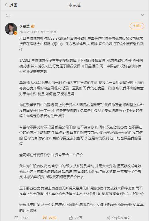 徽声在线记者 林晓 编辑 陈悦然 校对 李明轩 3月29日,知名歌手李荣浩通过个人社交媒体平台发布了一篇措辞严厉的长文,公开指责新生代歌手单依纯在3月28日及次日深圳举办的演唱会上,未经其正式授权便翻唱了其经典曲目《李白》,此举涉嫌严重侵犯版权。约两小时后,单依纯通过社交媒体简短回应,表示理解李荣浩的立场,并承诺将迅速与团队核实情况,向公众作出明确交代,同时强调自己始终重视版权保护,将严格遵守相关规定。 ▲李荣浩与单依纯在社交媒体上的公开交锋。 据李荣浩透露,单依纯团队在演唱会筹备阶段确实曾通过中国音乐著作权协会及其版权管理公司提出授权申请,但李荣浩方面已通过正式邮件明确且礼貌地拒绝了这一请求。然而,单依纯方面在未获得合法授权的情况下,仍坚持在3月28日的演出中演唱了《李白》,这一行为被李荣浩视为“明知故犯”的主观恶意侵权,对原创音乐生态造成了不可忽视的损害。 ▲李荣浩公开晒出中国音乐著作权协会的邮件截图,以证明单依纯方未获得演唱会演唱《李白》的合法授权。 回顾过往,单依纯在《歌手》节目中对《李白》的改编曾引发广泛讨论,但那更多局限于艺术层面的争议。而此次深圳演唱会上的未经授权翻唱,则无疑是对法律与版权底线的公然挑战。 版权作为音乐产业的基石,其重要性不言而喻。尊重版权不仅是行业健康发展的前提,也是每位音乐人应尽的法律义务。版权方有权自主决定是否授权及授权条件,这是法律赋予的不可侵犯的权利。单依纯作为职业歌手,其团队理应深谙版权流程与法律边界,成为版权保护的积极践行者。然而,此次事件却暴露出其在版权意识上的严重缺失,将他人创作成果视为可随意取用的资源,不仅辜负了公众对艺人的职业期待,更向市场传递了错误的信号,即版权规则可被无视,原创权益可被践踏。 从昔日的“被感动落泪的小女孩”到如今的“涉嫌侵权歌手”,单依纯的此次“任性”之举,不仅让自己陷入了法律纠纷的漩涡,更为整个音乐行业树立了一个极坏的榜样。在流量至上的时代背景下,版权意识更应被强化而非淡化。艺人的口碑与形象,不仅取决于其唱功与舞台表现,更在于其职业操守与版权意识的高低。 对于单依纯而言,及时承认错误、诚恳道歉并采取有效补救措施,是挽回公众信任、重塑个人形象的唯一途径。毕竟,艺术之路漫长且充满挑战,唯有尊重规则、敬畏创作,方能行稳致远、赢得尊重。 值班编辑 王思涵 关注“徽声在线” 获取最新最热的娱乐资讯 点击“分享”,传递热点 |